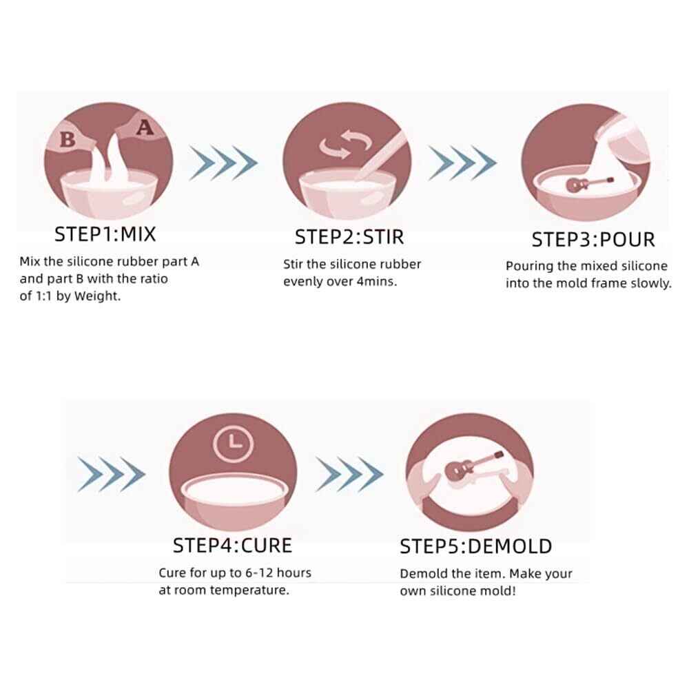 【使いやすい】1.A液・B液を1:1重量比で量る;2.割り箸などでよく混ぜる(約3~5分);3.箱(紙コップでも)に原型が覆いかぶさるまで流し込みます;4.24時間で自然に乾燥させます。⁂約30分で硬化が始まります。 硬化したら箱から取り出し原型を丁寧に抜いて完成です。