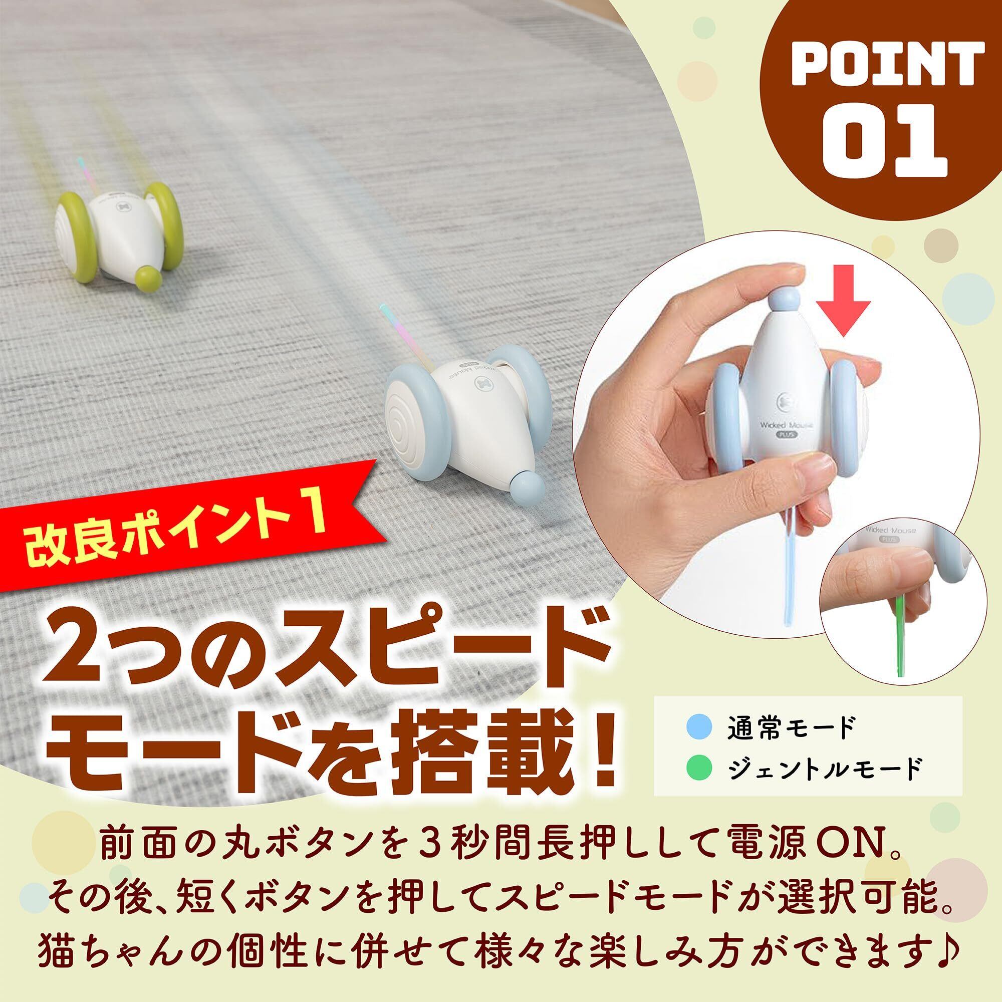 【改良ポイント①】2つのスピードモードを搭載!よりネズミに近い動きができるようになり、ネコちゃんがより楽しめるようになりました しっぽの部分に点滅するカラフルなLEDがついていて、光でも猫ちゃんの興味を惹きつけます!