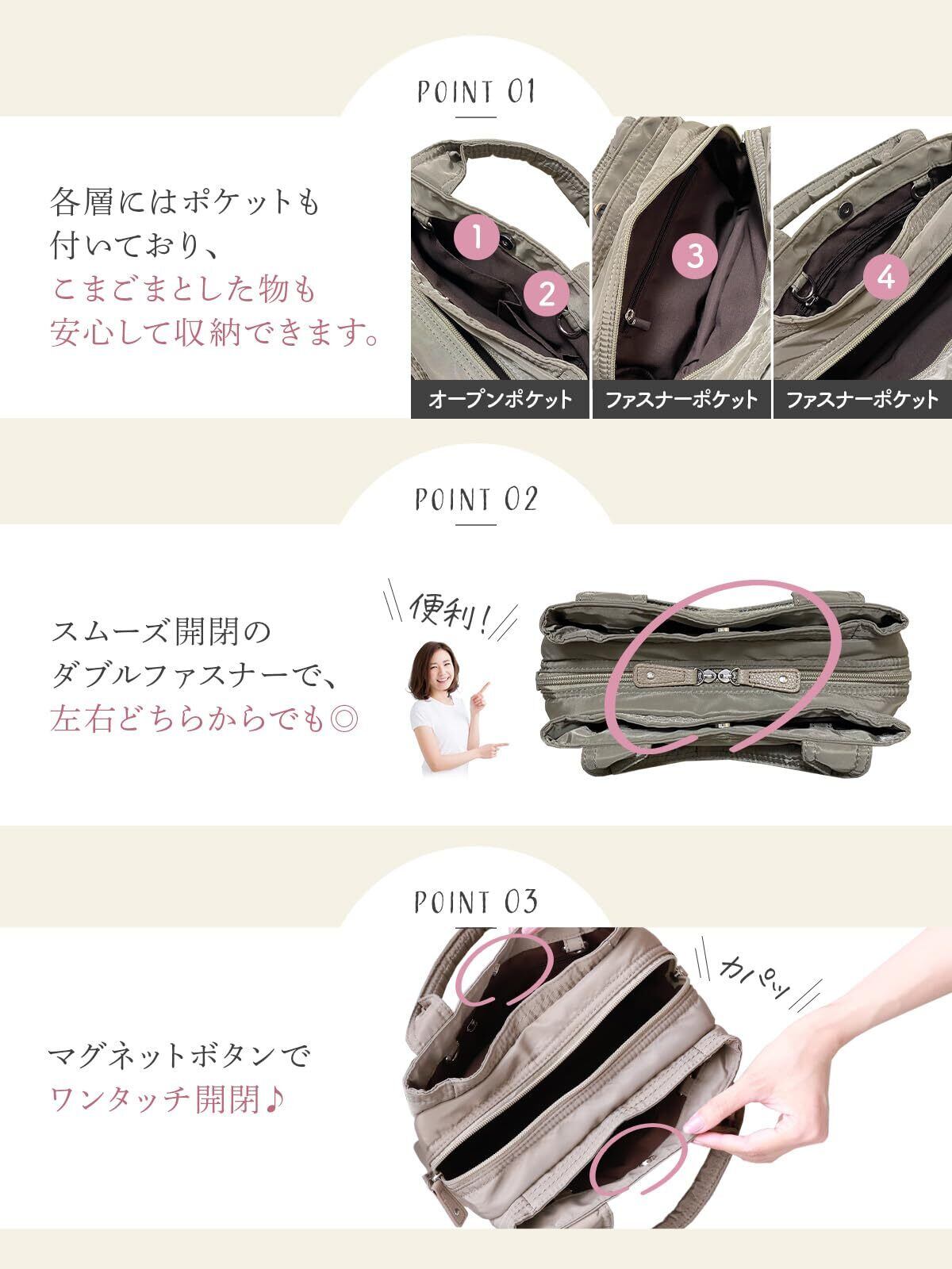 【かばん職人のこだわり満載】3層構造・ダブルジップ・マグネットボタン・Dカン・スマホポケットなど職人が使い勝手を追求した逸品です!しっかりしたマチ広構造は、お弁当箱も収納する事が出来、ランチバッグとしてもご利用いただけます。