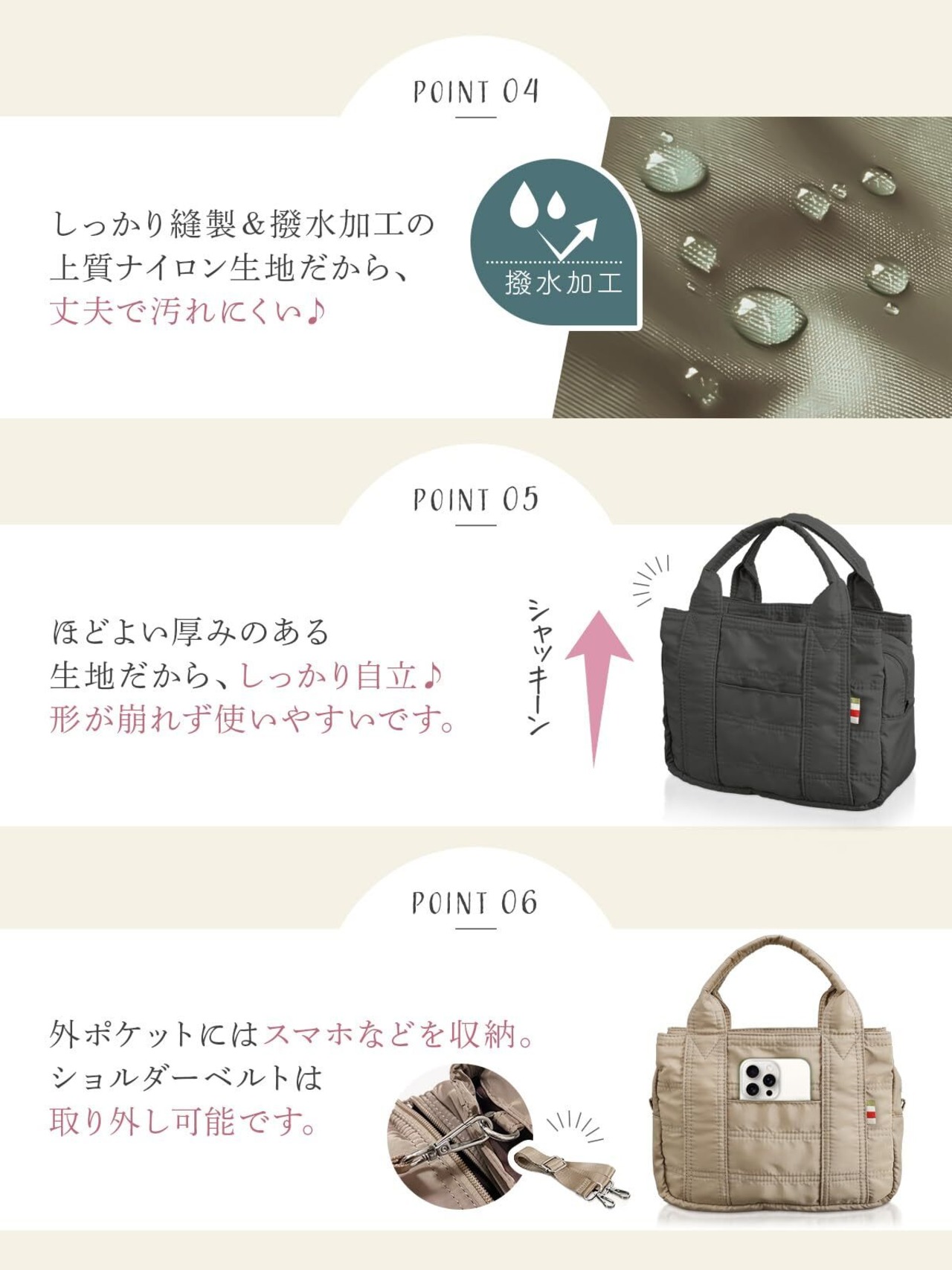 【便利なショルダーベルト付】荷物が多いお買い物シーンでは、専用のナイロンショルダーベルトで肩掛けバッグをしても大活躍。斜め掛けをしてもバランスの取れたシンプルなデザインで幅広いスタイルに対応いたします。ベルト用のDカンは4か所設置し、両肩どちらでも対応可能にいたしました。【ショルダーベルトの長さ】約67㎝~約120㎝程度