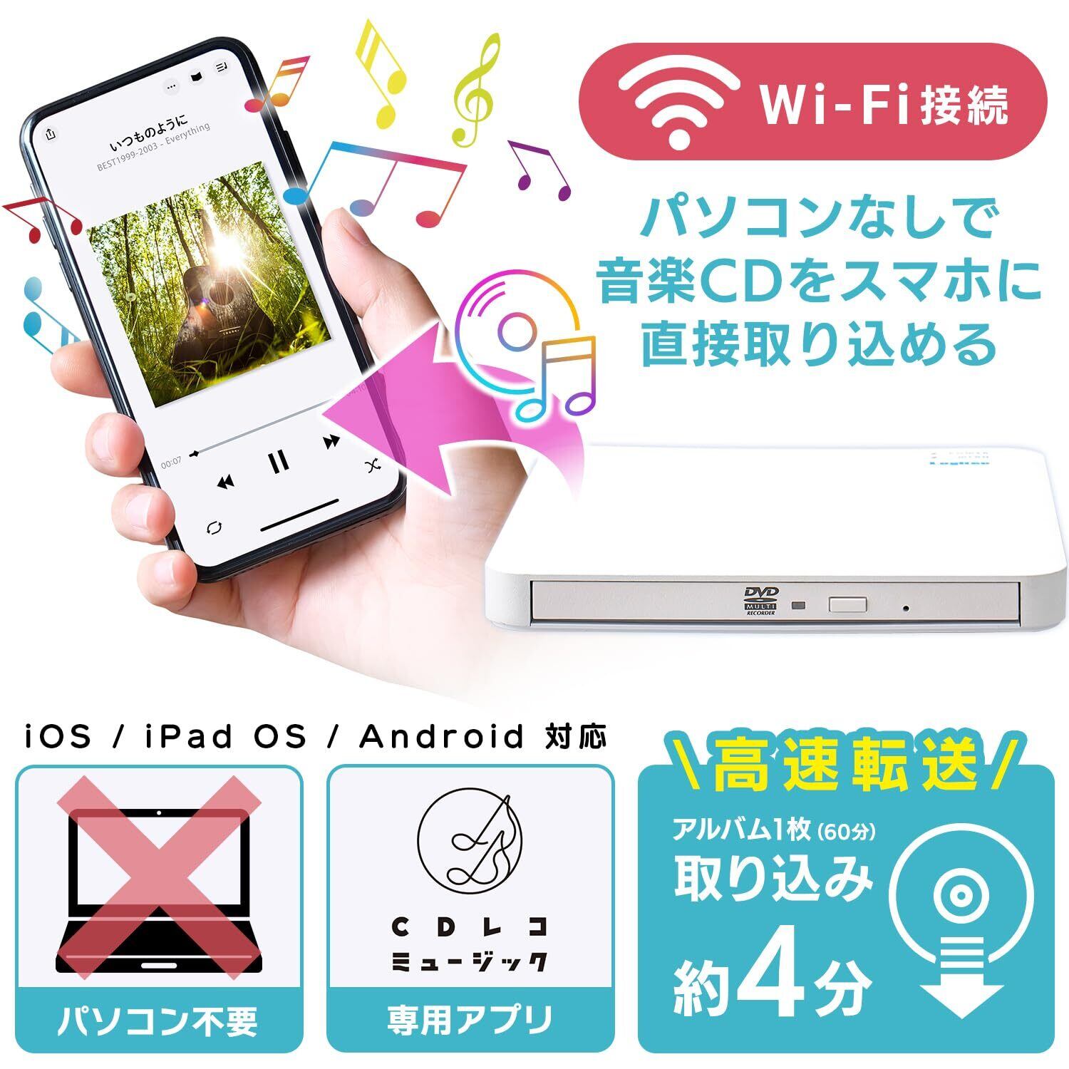 ロジテック スマホでCD DVD 再生 Wi-Fiモデル スマホ CD 取り込み ワイヤレス CDレコーダー CDプレーヤー パソコン不要 【 iphone 15 16 pro/Android/タブレット 】 高速/DVD 再生 対応 LDR-LSM5WWUVDWH