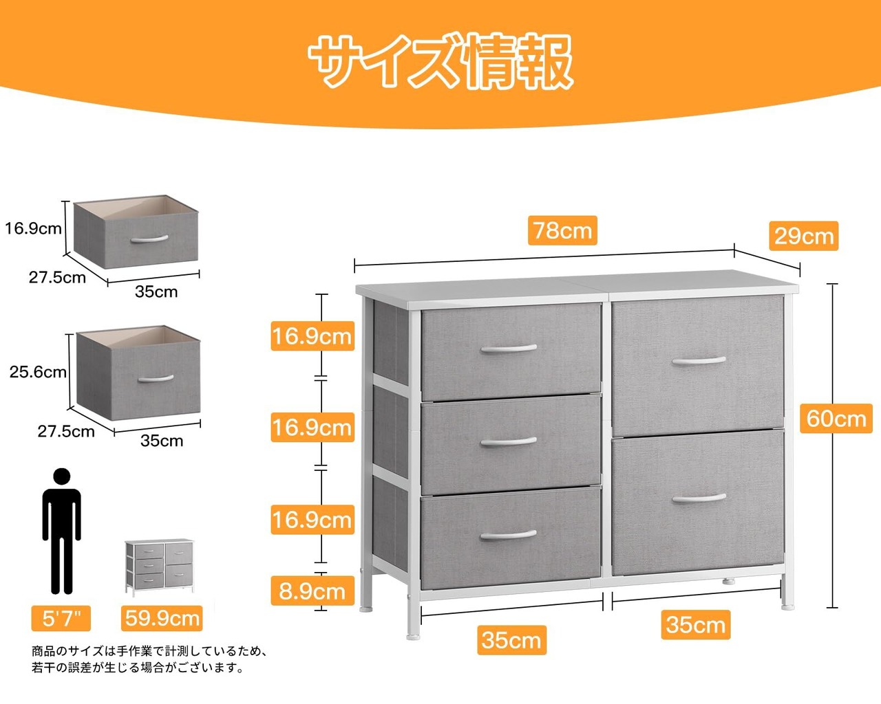 材質 アルミニウム, 木材, ファブリック製5段チェスト