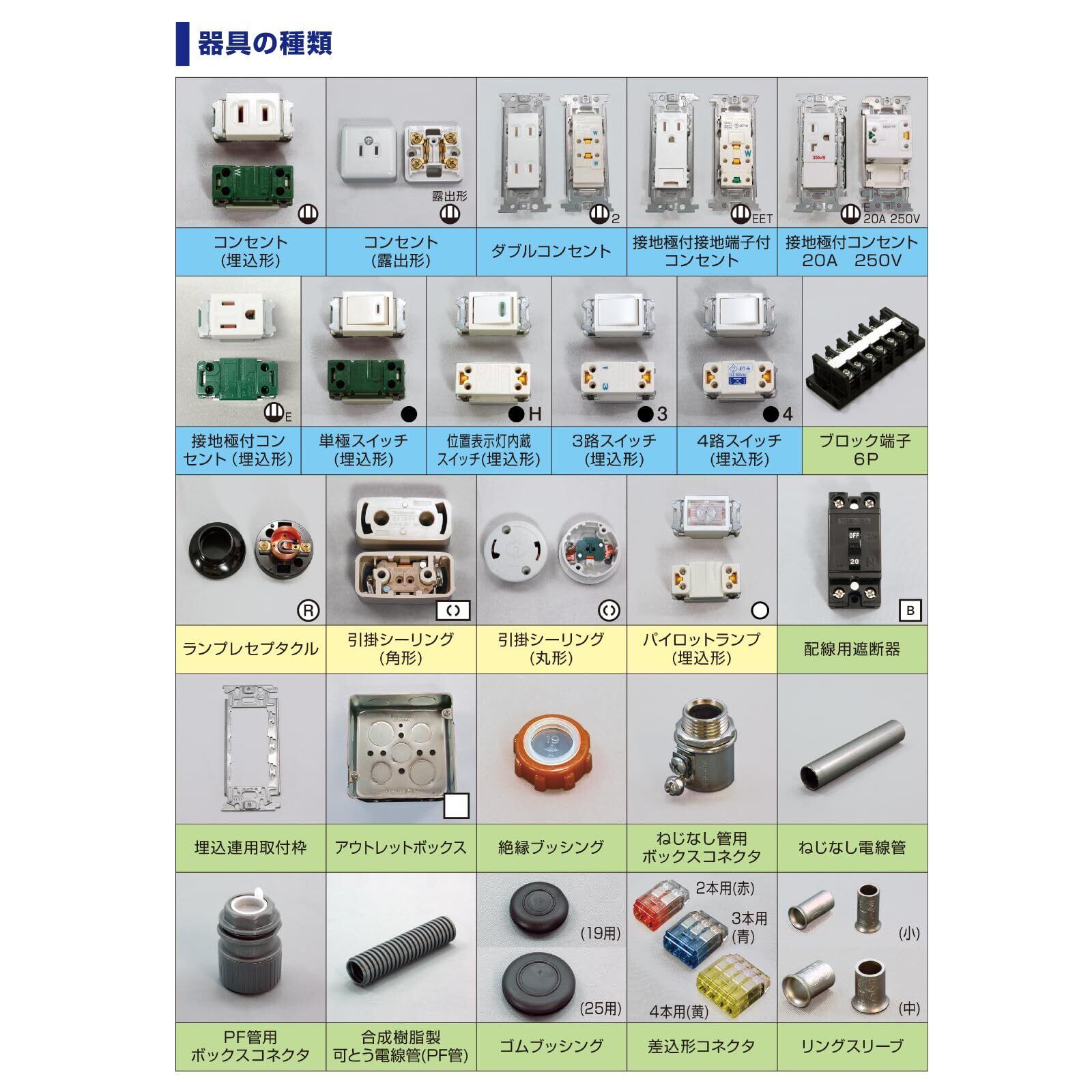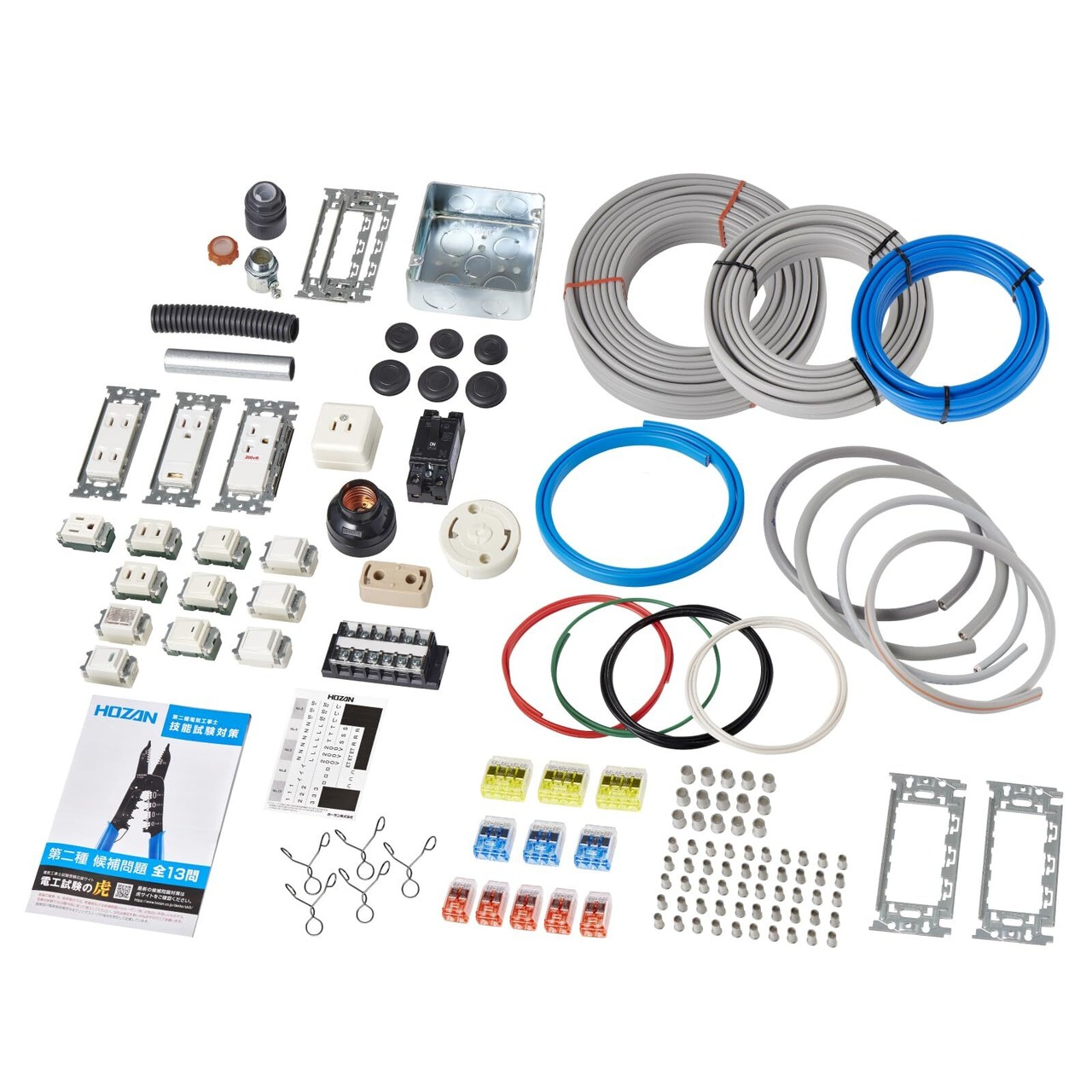 第二種電気工事士技能試験の候補問題全13問を、それぞれ1回ずつ練習できる電線と器具がセットになっています。