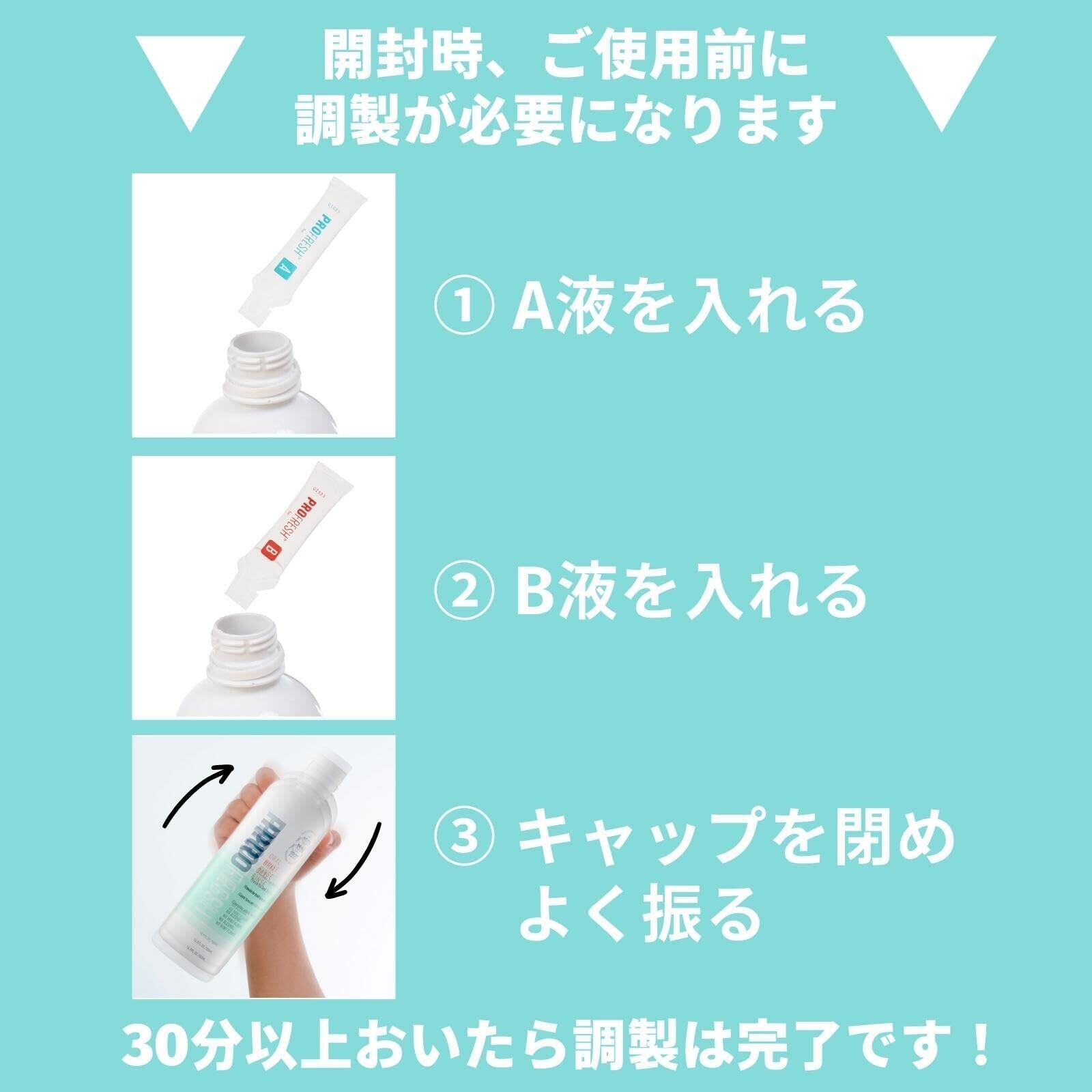 ■初回使用前の調整方法 1.ボトルのキャップを開け、A液を入れ、よく振って下さい。 2.同様に、B液を入れ、よく振って下さい。 3.30分以上おいてから、ご使用下さい。 ■使用方法 調整した本品をキャップ1杯程度お口に含み、約1分間、口中全体をブクブクガラガラとよくすすいで下さい。 更にしっかりケアされたい方には歯ブラシやタングスレーパー、デンタルフロスも使った下記の使用方法をお勧めします。 1.本液を7.5cc(目安:キャップ1杯)/1回、約1分間、お口をすすいで下さい。(注:吐き出さない。) 2.そのまま、液がこぼれないように歯ブラシをお口に入れ、歯、歯茎、上顎など口中を満遍なくブラッシングして下さい。 3.口中の液を一度吐き出し、タングスクレーバーで数回、なるべく舌を出しながら奥の方から手前にひくようにして、優しく表面を清掃して下さい。1回1回タングスクレーバーを水につけてください。*さらに本液をつけたデンタルフロス、歯間ブラシで歯間を清掃するとより効果的です。 4.再度、本液7.5cc(目安:キャップ1杯)/1回、約30秒間、お口をすすで下さい。*頭を後ろに倒し、なるべく舌をだしながら、口をすすぐとより効果的です。