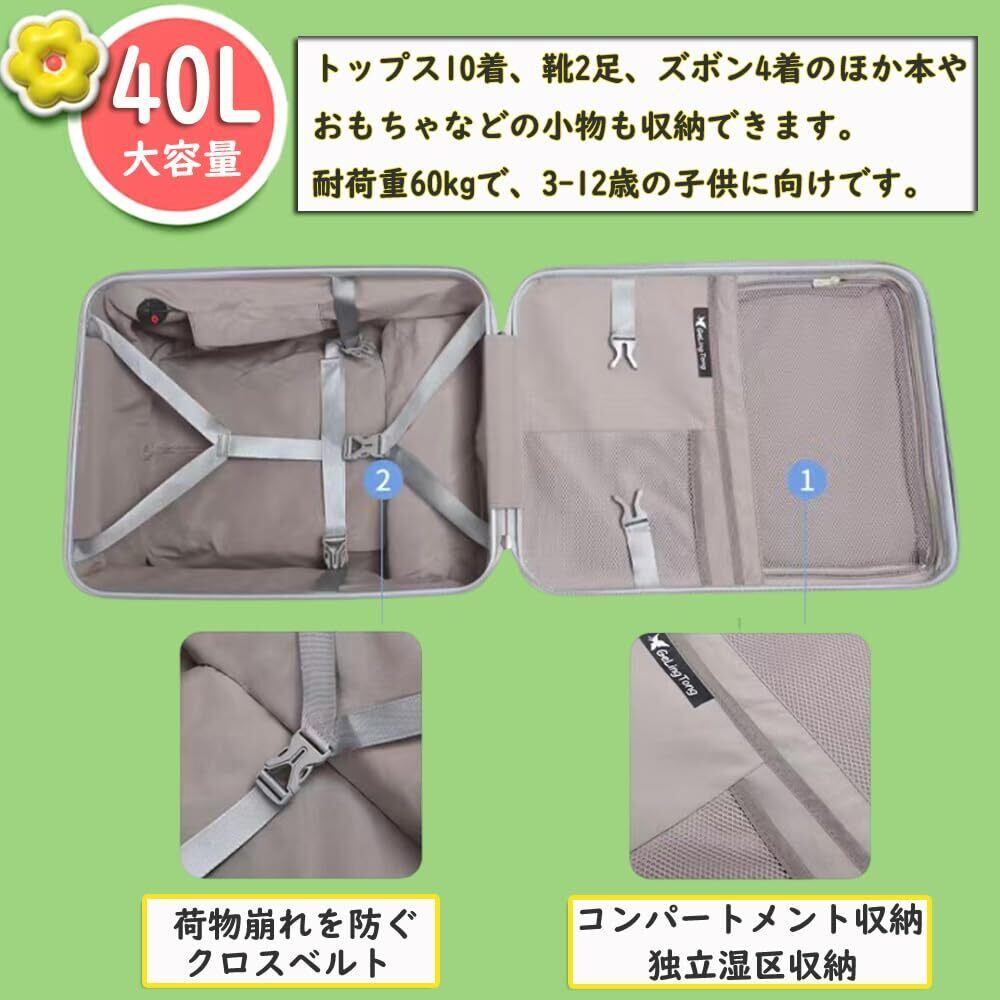 【商品情報】アルミニウム合金2階段調整キャリーバー、ダイヤル式ロック、金属ジッパー、耐久性に優れたABS素材のボディーなどの装備が備えています。ケース本体サイズ約幅35x奥行25x高さ47cmで、約40Lの容量を収納できます。トップス10着、靴2足、ズボン4着のほか本やおもちゃなどの小物も収納できます。耐荷重60kgで、3-12歳の子供に向けです。商品には保証付きで、到着後何か問題がありましたら、ぜひご遠慮無くおっしゃってください。
