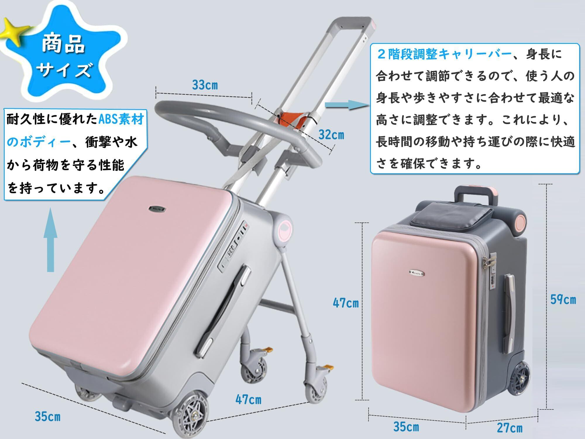 【子親ハンズフリー、子供乗れるスーツケース】:ベビーカーとスーツケースが一体に!荷物を入れることだけではなく、ベビーかーや椅子の代わりに役もある!お子様を乗せてスムーズに移動できるキャリーケース。この商品1点だけで、子どもが楽しんで親も抱っこから解放されて楽しく旅行できる。