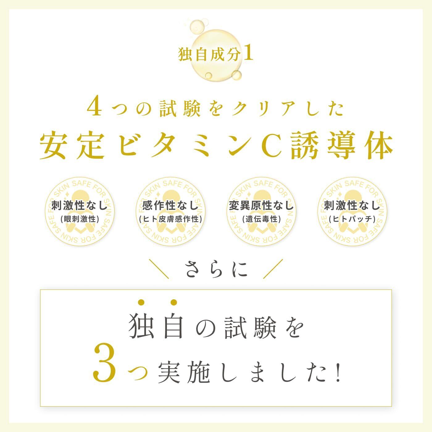 4つの試験をクリアしたビタミンC配合:「眼刺激性:刺激性なし」「ヒト皮膚感作性:感作性なし」「遺伝毒性:変異原性なし」「ヒトパッチ:刺激性なし」4つの厳しい試験をクリアしたビタミンCを採用。 高濃度でもピリつきにくく、安心してお使いいただける クオリティを目指しました。