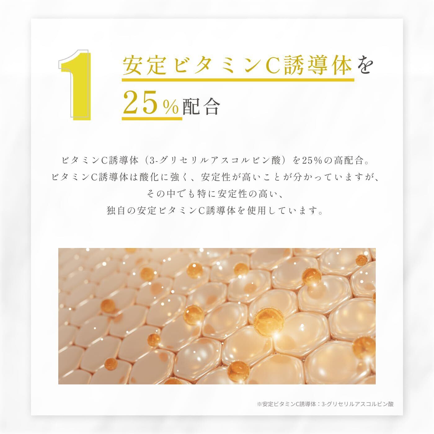 安定ビタミンC誘導体を25%配合:ビタミンC誘導体(3-グリセリルアスコルビン酸)を25%の高配合。 ビタミンC誘導体は酸化に強く、安定性が高いことが分かっていますが、 その中でも特に安定性の高い、独自の安定ビタミンC誘導体を使用しています。