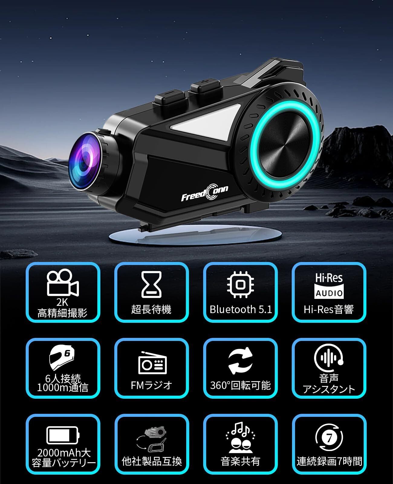 FreedConn R3 Pro バイク インカム カメラ付き 2Kドライブレコーダー兼用 6人同時通話 1200M通信距離 33時間使用可 2000mAhバッテリー 140°超広角 Bluetooth/WiFi対応 7時間録画 FMラジオ 360°回転 他のブランド互換