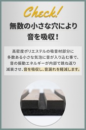 【無数の小さな穴で音を吸収】高密度ポリエステルの吸音材部分に多数ある小さな気泡に音が入り込む事で、音の振動エネルギーが内部で跳ね返り減衰させ、音を吸収し音漏れを軽減します。【手軽に設置、賃貸のお部屋でも】壁に取り付けるだけで防音対策ができます。賃貸物件では、剥がせる両面テープと付属のピンを使用、しっかりと固定したい場合は接着剤や両面テープの併用も可能です。