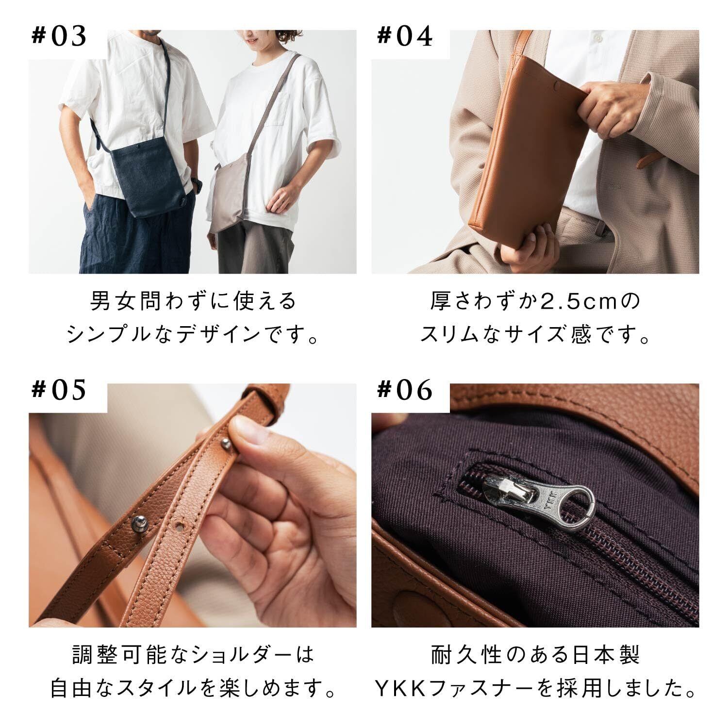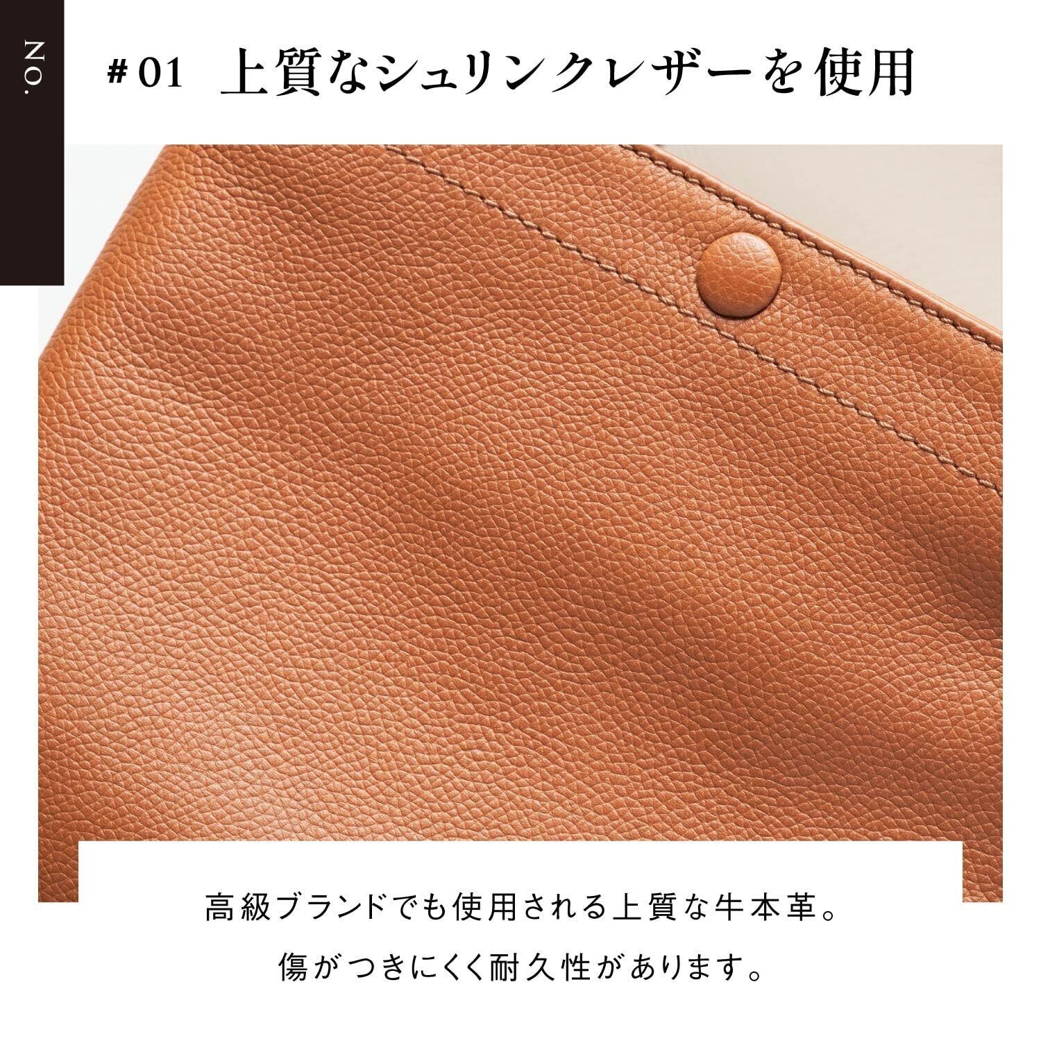 【傷のつきにくく柔らかなソフトシュリンクレザー】革は牛本革(ソフトシュリンクレザー)を使用し、柔らかな手触り。 傷がつきにくく耐久性があるので毎日使う財布にピッタリです。【必要十分な収納スペース】スマホ、財布、モバイルバッテリー、A5ノート、イヤホン、ハンドクリームなど必要十分に入る収納スペースです。
