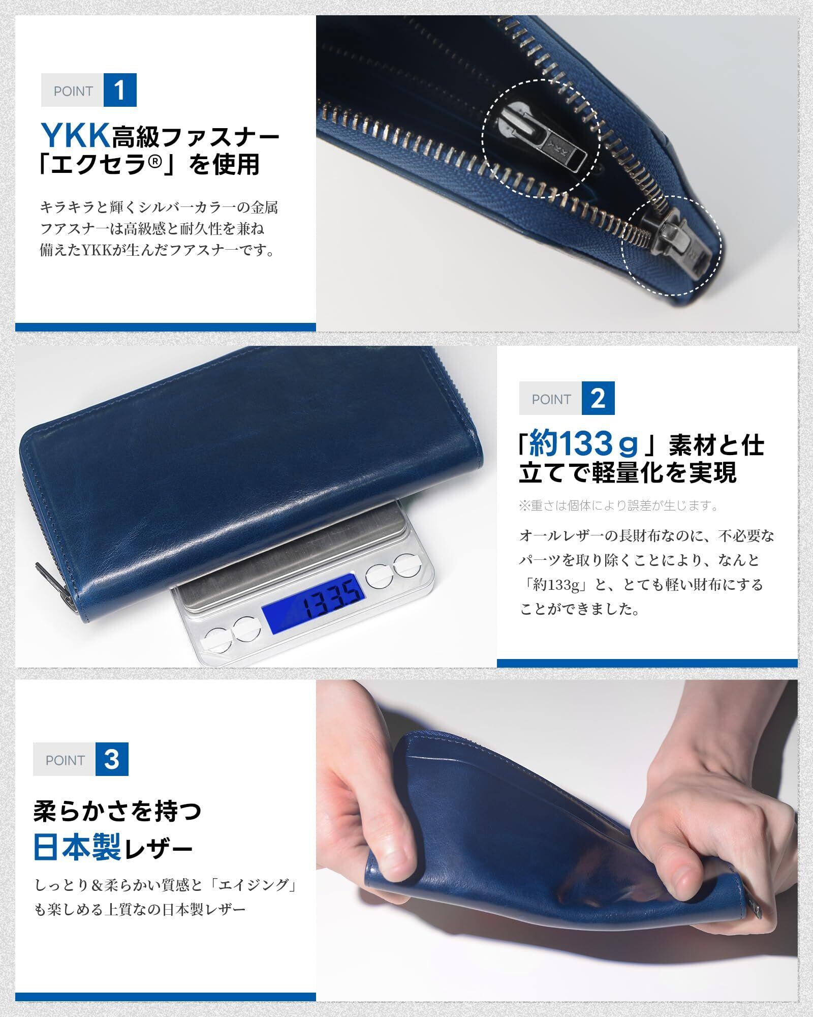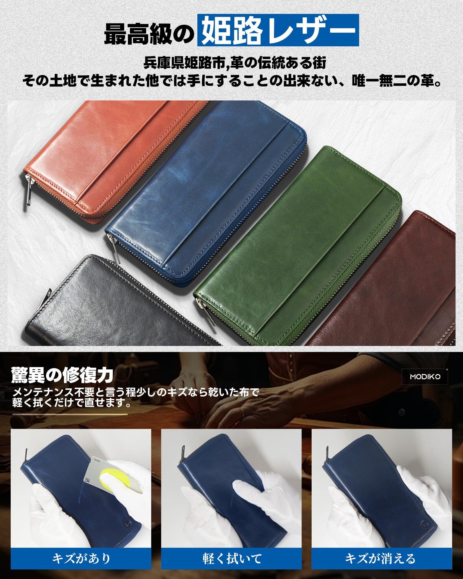 [Modiko] 財布 メンズ 長財布 姫路レザー 本革 日本製 小さい長財布 大容量 一流の財布職人が作る マチ付き 小銭入れ YKKファスナー 使いやすい 薄い 紳士 ビジネス 人気 男性 プレゼント 父の日 (ネイビー)