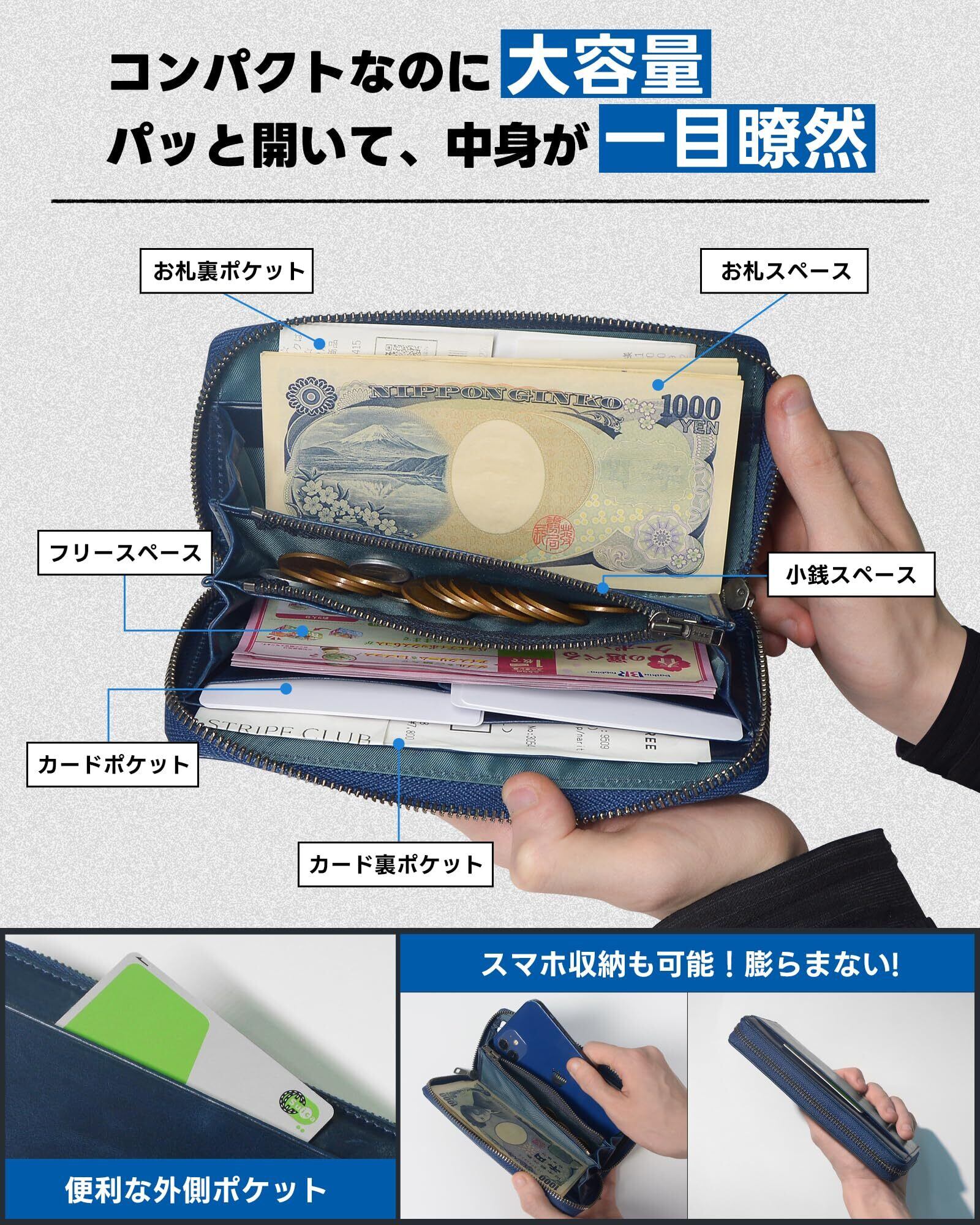 【コンパクトでも大容量の驚き】コンパクトなサイズながら、最低30枚のお札、20枚の小銭、最大5枚のカードが立体カードポケット2つに収納可能財布 大容量。仕切りのないカードポケット1つと自由に使えるポケット2つも搭載しています。この革財布はスマートフォンも収納でき、持ち運びに便利ですが、膨らまずにスッキリ。サイズは15×9×2cmで、一般的な財布よりも2cmコンパクトです。