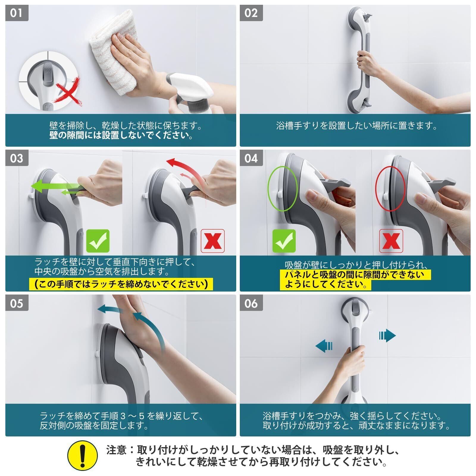 ご注意事項&適切な壁:手すりサイズ:約42.8 8.1 cm。吸盤サイズ:約9.1 cm。耐荷重:110kg240ポンド。手すりに体重をかけないでください。子供、高齢者、介護者の安全のため、吸盤は金属、ガラス、セラミックタイル、ステンレス、アクリルなどの滑らかで非多孔性の平面にのみ貼り付けられますが、凹凸不平のセラミックタイル、織り目加工のボード、未完成の大理石、壁紙、タイル ギャップ、塗装された壁などの面には適していませんのでご注意ください