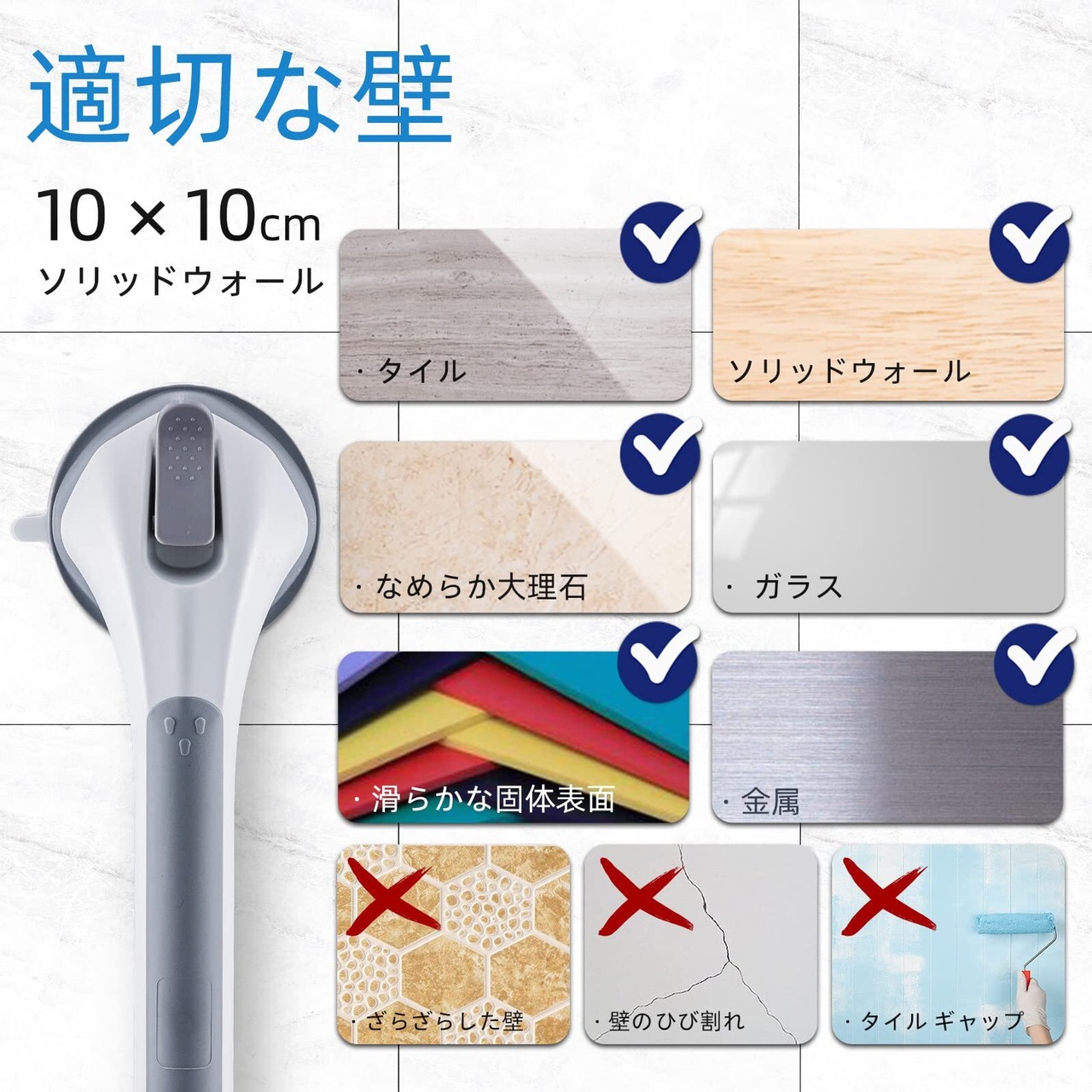 抜群な吸盤デザイン:強力吸盤はアップグレードされたより厚いTPE素材で製作しており、より耐久性があり、更に強力です。超耐荷重で、壁に長く掛けられ、より強力な吸引力を備えています。手すりの取っ手が広く、持ちやすくなっています。 広いグリップエリアは強い吸引力を保障できます