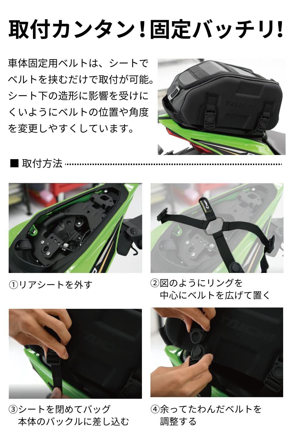 日帰り程度の荷物を積載するのに適度なサイズ。車体固定用ベルトの装着が容易で、様々なシートの形状に合わせやすいオクタフレックスベルトを付属しています。 ※オフロード車等、付属のオクタフレックスベルトがシート下に挟み込めない車両の場合には、別売りのRSB316オプションセッティングハーネスを使用し、フレーム部分や荷掛けフック等への固定が可能です。
