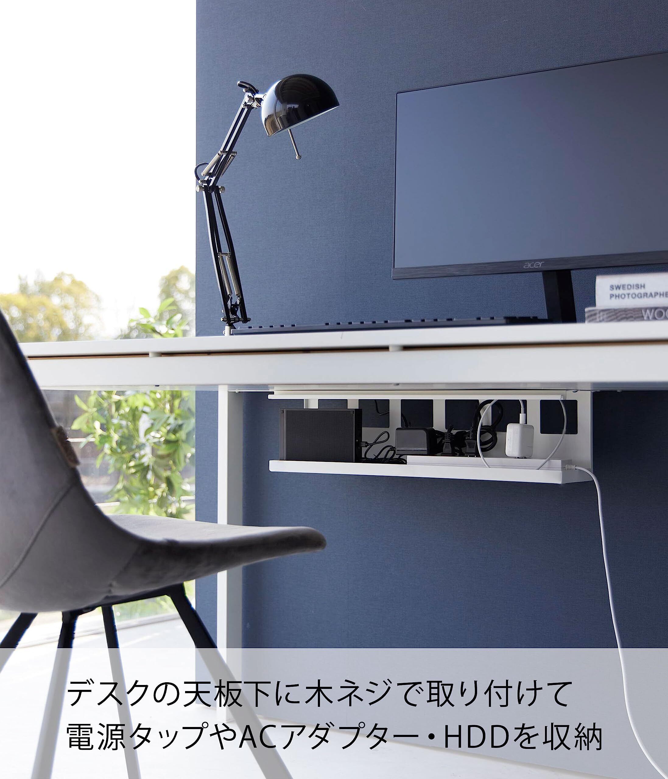 デスクの天板下に木ネジで取り付けて電源タップやACアダプター・HDDを収納。