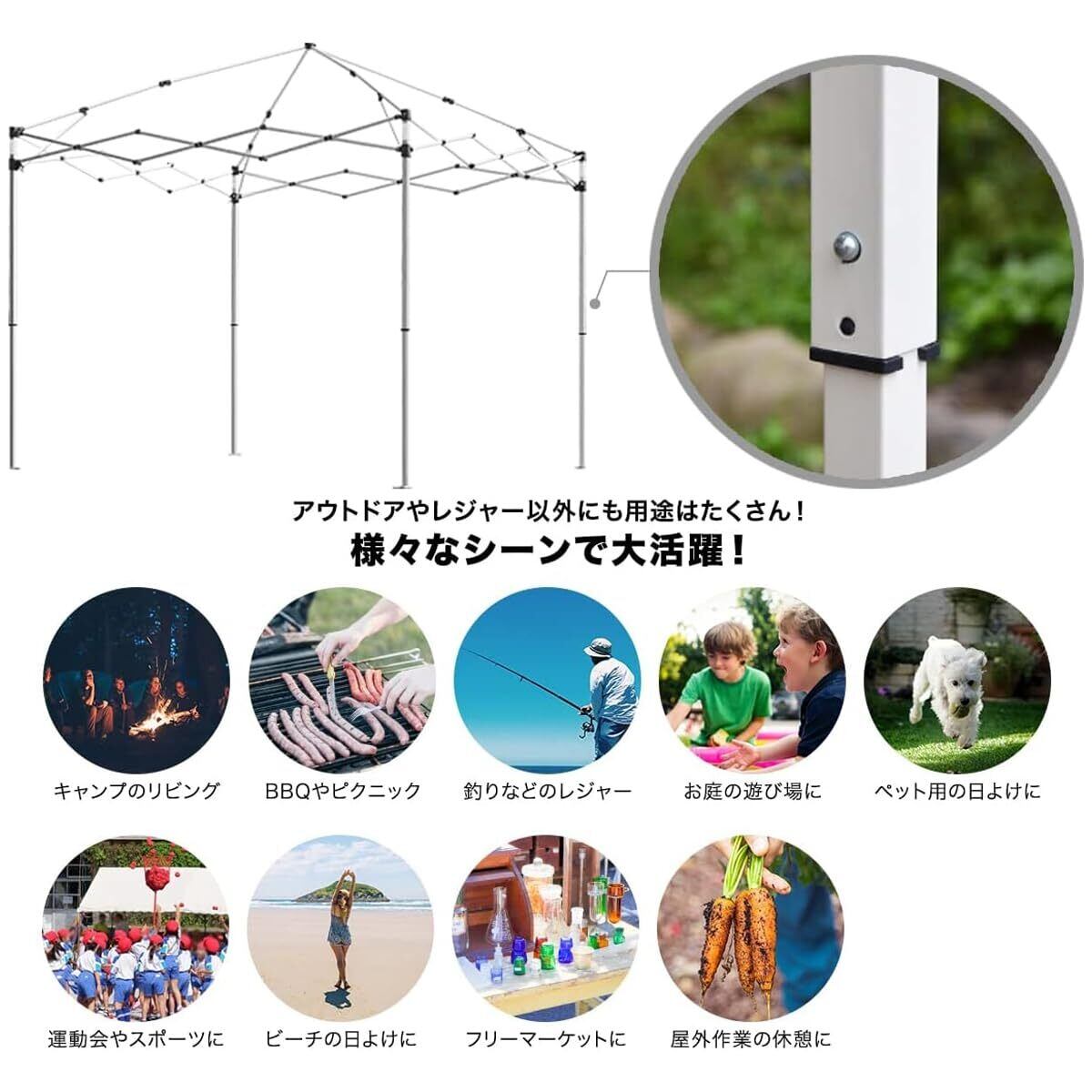 【強度・安定性に優れたタープテント】 フレームは強度・耐久性あるスチール製。 スチール製はアルミ製に比べて重量はありますが、安定性ある強度で、しっかりと設置が可能。 コンディションが悪い場所でも安心です。 ※ホワイトカラーは、遮熱性あるシルバーコーティングではなく、防水性高いPUコーティング生地 を使用しています。 シルバーコーティング生地を採用した別カラーより、遮熱効果が低くなります のでご了承ください。 また、UVカットコーティングは施されています。