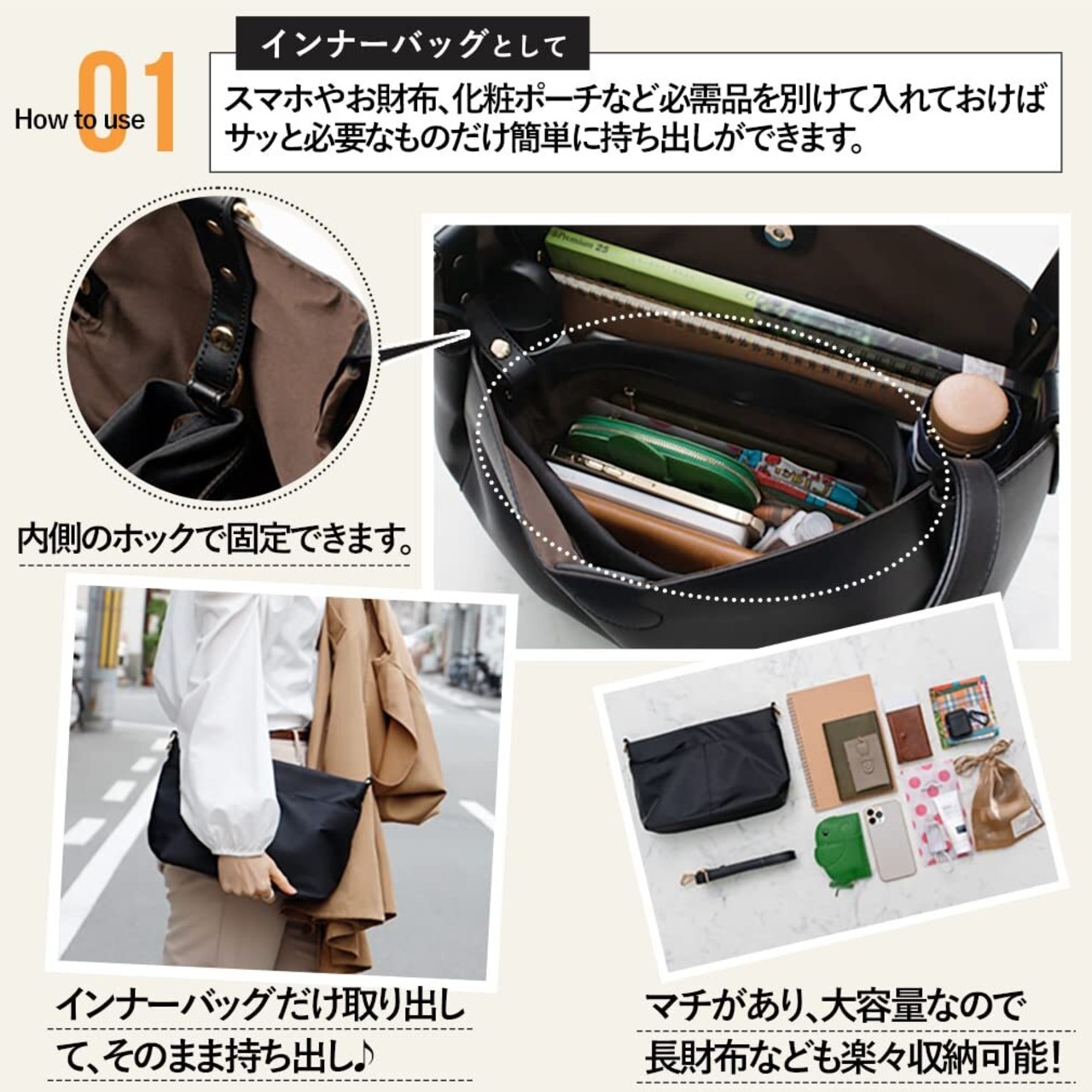 《お客様のお声によりさらに実用的になりました。》 A4サイズがすっぽり収納できる大きいサイズのトートバッグ。 実用的なサイズ感とアウターの上からも肩掛けできる長めのハンドルが魅力。 高密度ナイロンを使用した丈夫なポシェットが付属されています。 インナーバッグとしてはもちろん、バッグ単体でショルダーバッグとしても使用可能。 無駄なものを省いたシンプルですっきりとしたデザインなので、 どんなコーデも合わせやすく使いやすいのもうれしいポイント! 年中使いたいヘビロテバッグ間違いなし!