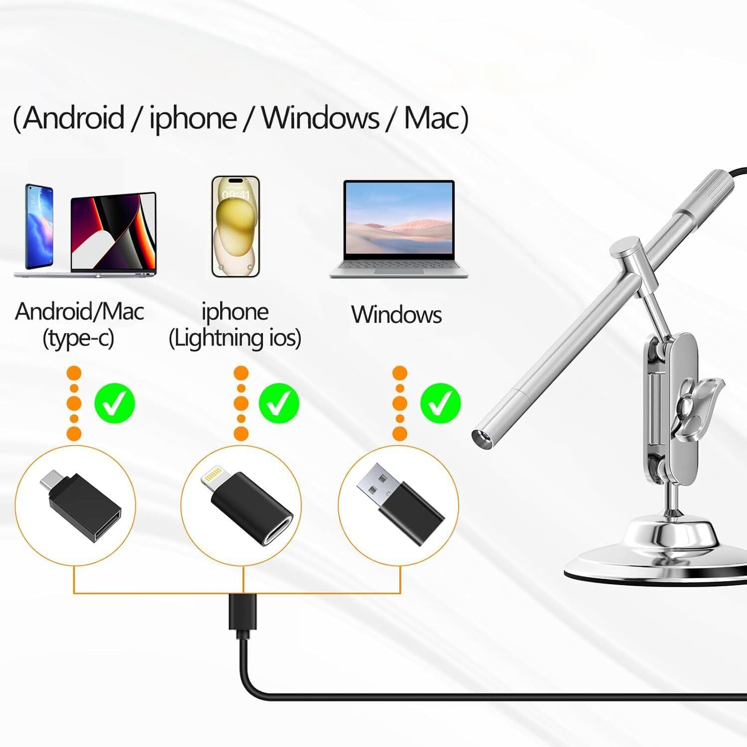 このUSB顕微鏡は、iOS、Android、Windows、MacOSなど、さまざまなシステムデバイスに対応した複数のインターフェースを装備しています。
