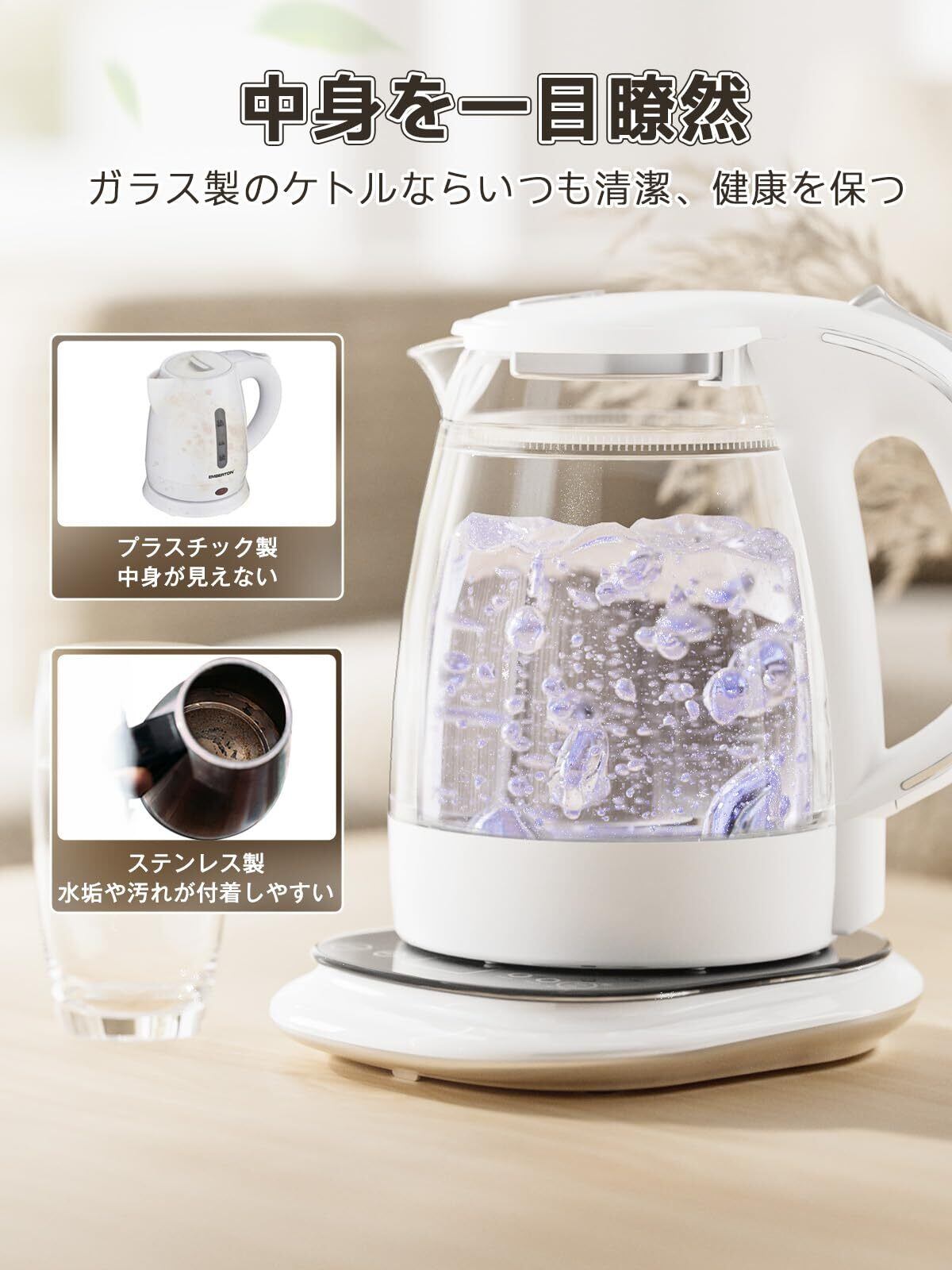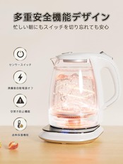【高品質の温度センサー搭載&安全・安心な三重保護】ガラスケトルは沸騰後に自動電源オフ、過熱保護と空焚き防止の三重の安全保護機能が搭載されています。温度センサーは1℃の変化まで正確に測定でき、ポットの温度が異常であると検知された場合、すぐに電源が切断。また、PSE認証と日本食品安全認証もしっかり取得しておりますので、お年寄りやお子様のいるご家庭でも安心してご利用いただけます。