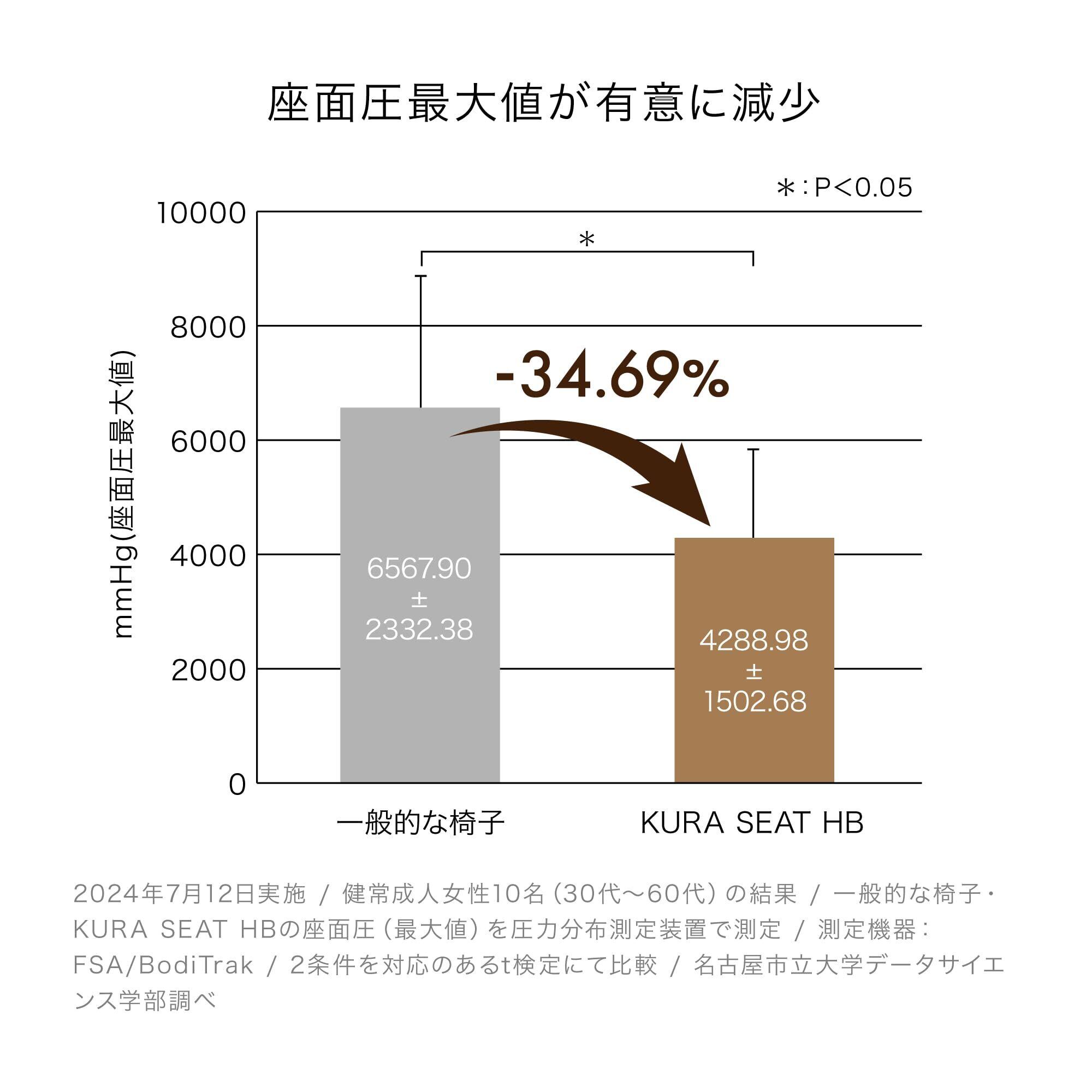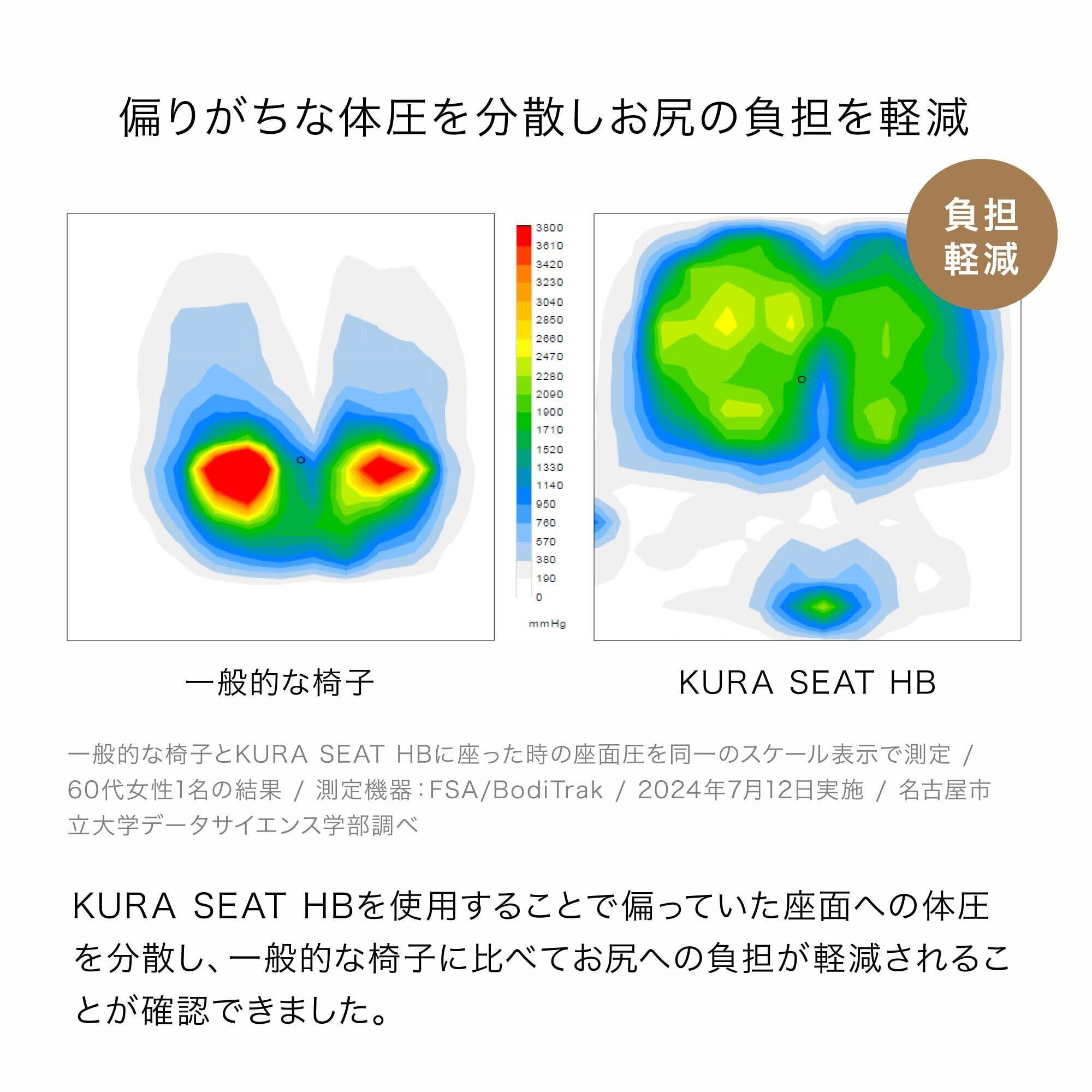 ③お尻の丸みにあわせた曲線構造 KURA SEAT HBの座面は、お尻の丸みにあわせた滑らかな 曲線を描いています。椅子の平らな座面と違い、お尻を前 後・左右から包み込むようにフィットするため、やさしく 心地よい座りを実感できます。