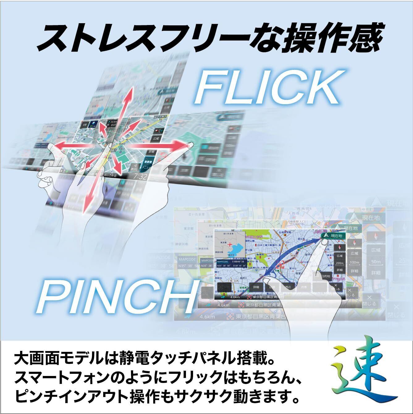 ハンドルから手を離さず、話して操作。業界唯一 「8V型フローティング」彩速ナビ。地上デジタルTVチューナー/BluetoothⓇ内蔵 DVD/USB/SD AVカーナビゲーション