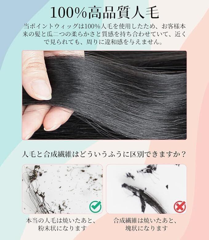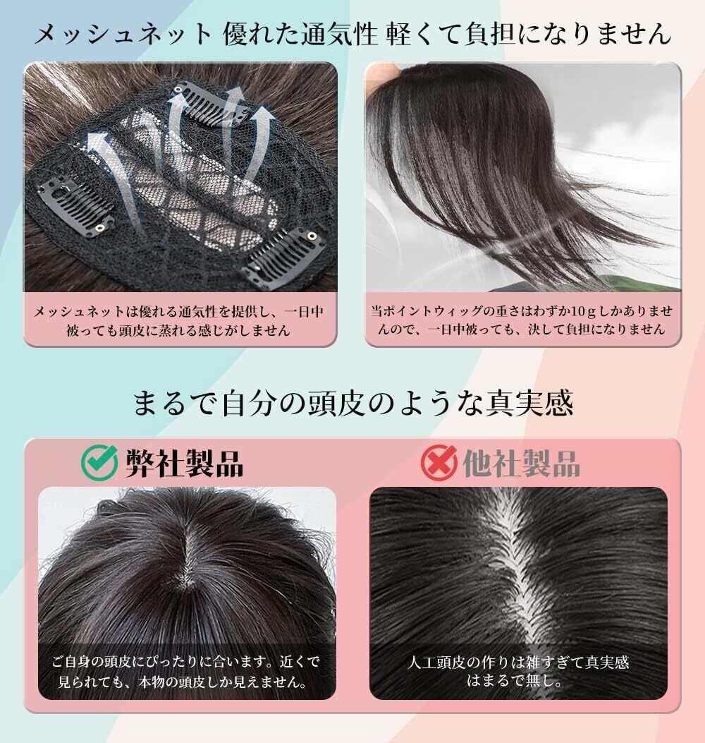 「髪の量を増やす・100%人毛」当ポイントウィッグは100%人毛を使用したため、お客様本来の髪と瓜二つの柔らかさと質感を持ち合わせていて、髪の量を増やす同時に違和感がなく、近くで見られても気づかれることがありません。 「抜群な固定力」人毛のため、本来の髪と同じように染めたり、切ったりすることもできます。ポイントウィッグの固定力が強いので、突然取れたりするようなことがありません、強い風でも問題ありません。