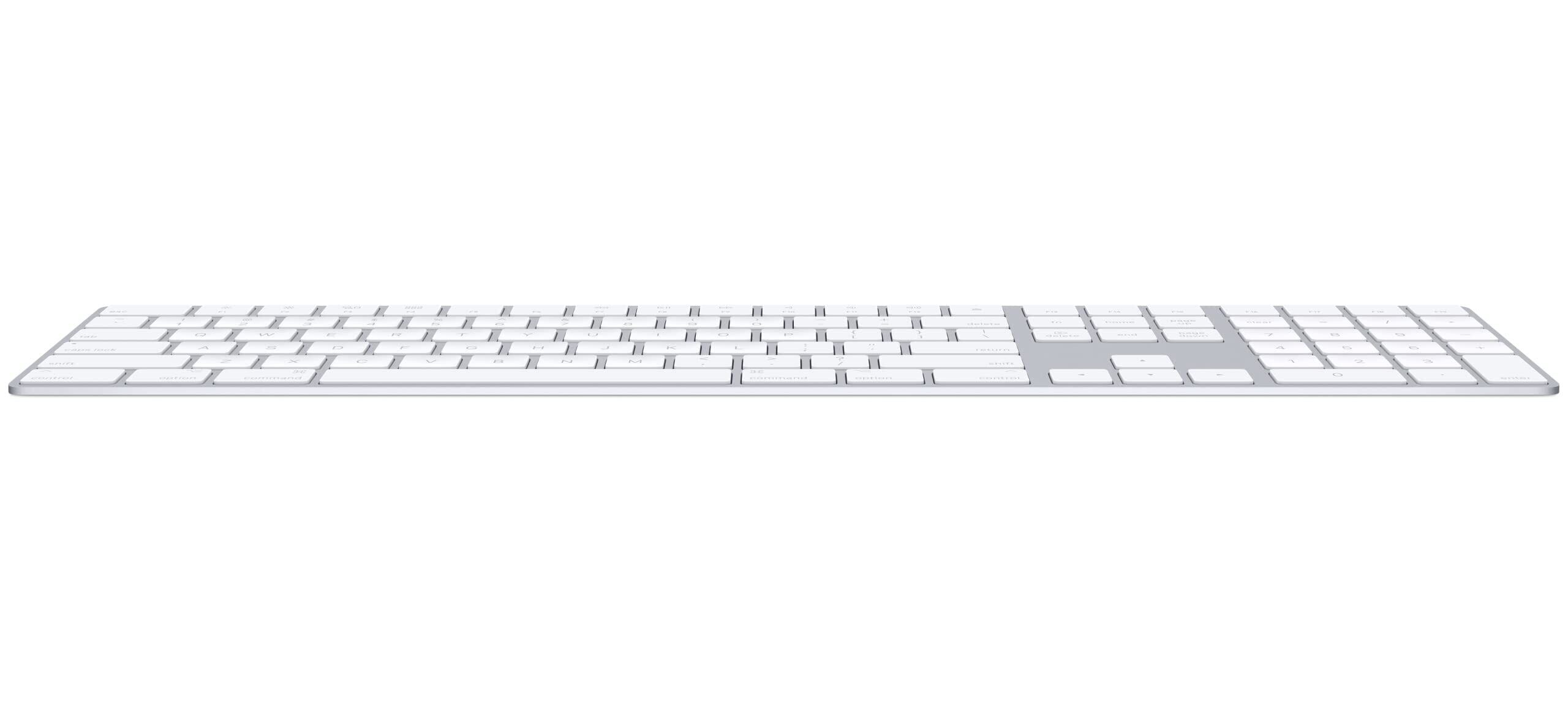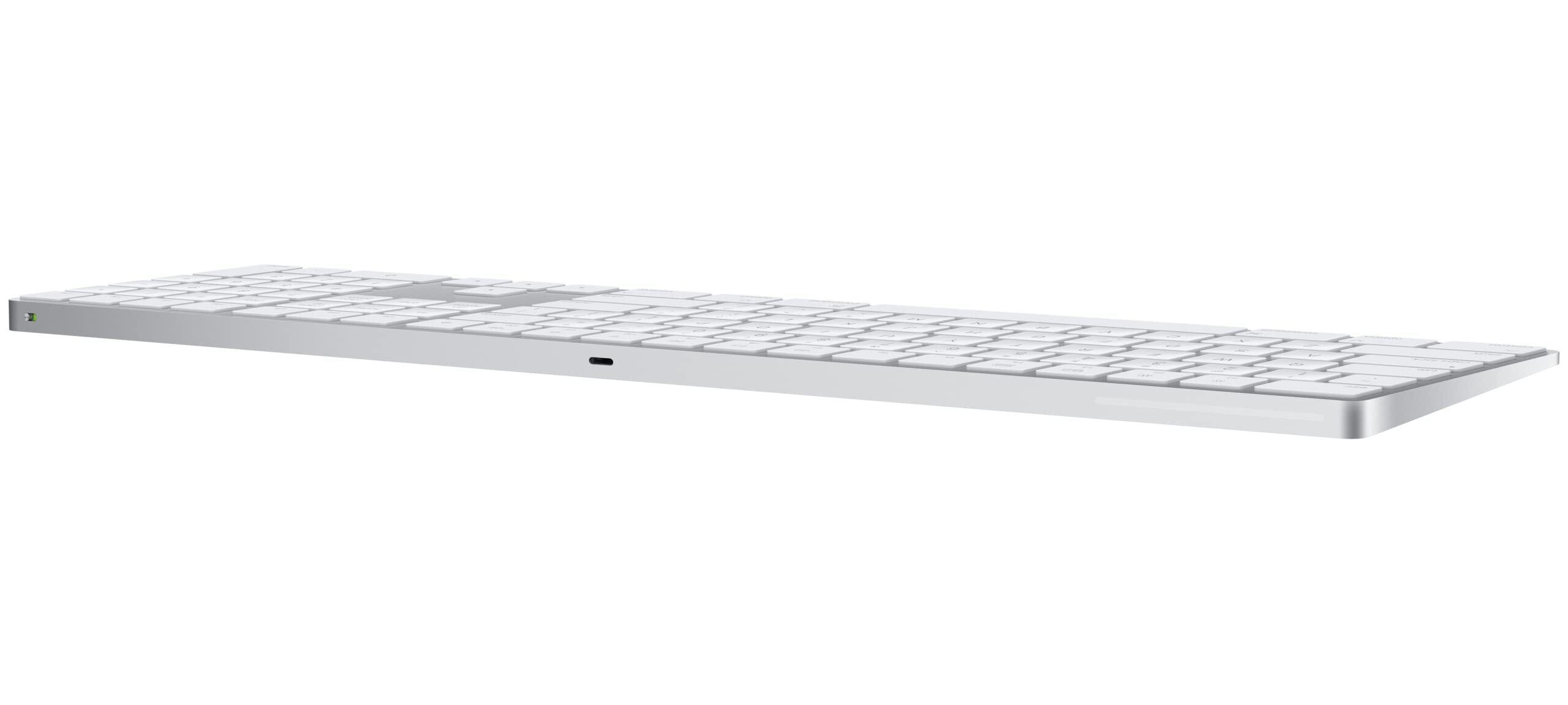 テンキーが付いたMagic Keyboardはより広いレイアウトを持ち、書類をすばやくスクロールできるようにする操作キーや、ゲームに適したフルサイズの矢印キーもついています。それぞれのキーの下にあるシザー構造はキーの安定性を向上させます。そのうえキーの運びを最適化し、低いフォルムを採用したので、快適で正確なタイピングを行えます。テンキーはスプレッドシートや財務アプリケーションを使う時に便利です。充電式の内蔵バッテリーは驚くほど長持ちするため、一回の充電でキーボードを約1か月以上駆動させることができます。1