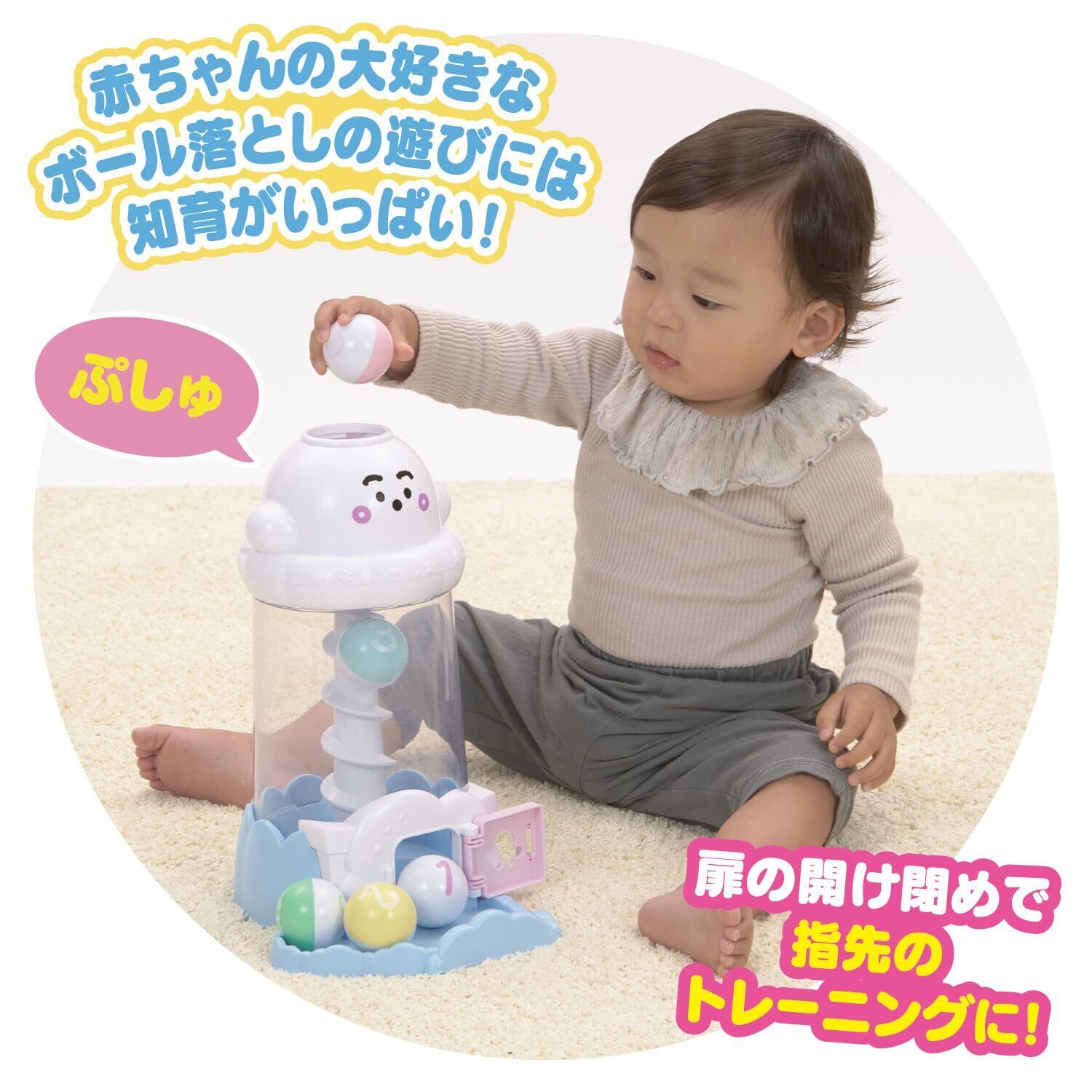 入り口からボールを入れると、ボールがコロコロ転がり、ぷしゅぷしゅボイス9種と効果音4種の楽しい音がたくさん流れます。