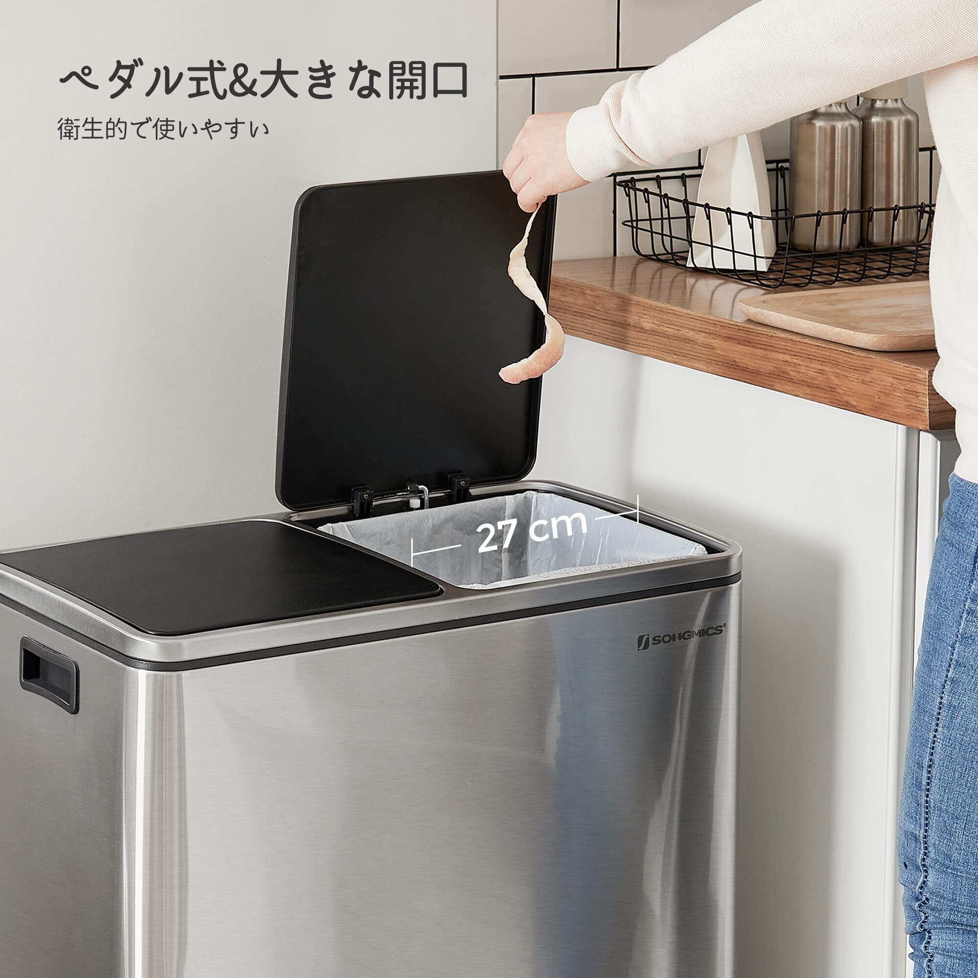 SONGMICS ゴミ箱 ダストボックス 2分別 ゴミ袋付き ペダル式 2x30L インナーバケット二つ ステンレス 密閉 音無し おしゃれ スリム 室内 キッチン 蓋付き LTB60NL