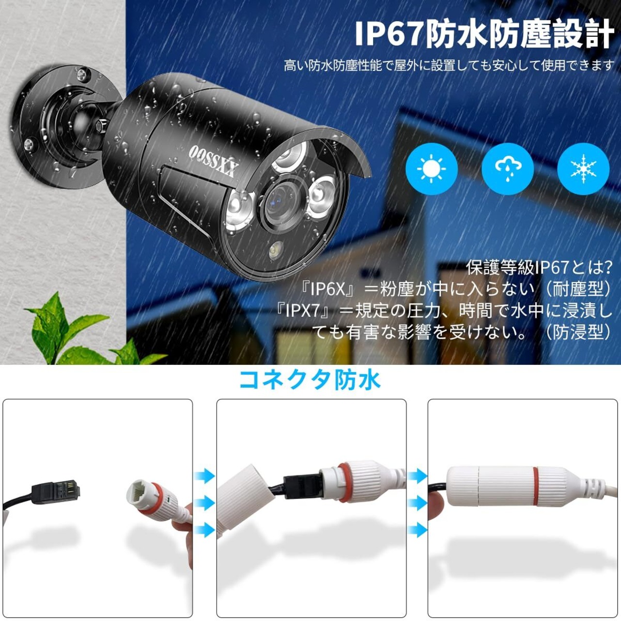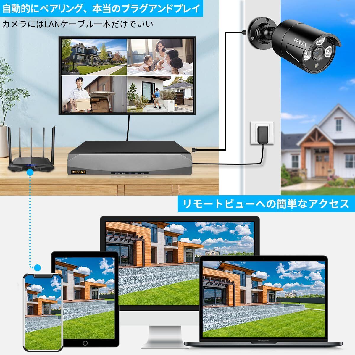{プラグエンドプレイ・増設可能} 弊社の防犯カメラ有線なので取り付けはとても簡単で、LANケーブルだけでカメラと本体を接続すれば、すぐご利用いただけます。更に、LANケーブルに防水コネクタが付いているので、poe防犯カメラを屋外に取り付けてもLAN接続部が雨に濡れません。弊社の防犯カメラセットはご必要によって最大8台まで増設できます。防犯カメラ4台セットで、また4台カメラ追加できます。尚、本社は取り付け作業を行っていないので、予めご了承ください。
