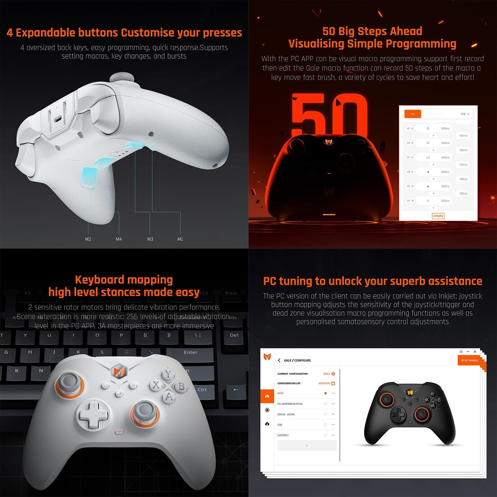 【ホール効果トリガー】ホール効果コントローラーの高精度トリガーはあらゆるゲームに最適で、レーシングゲームにはリニアトリガー、FPSにはヘアトリガー(ソフトウェア)が最適です。 【FPS Eスポーツコントローラー構成】有線の場合は1000 Hzのeスポーツレベルのリターンレート、無線の場合は125 Hzのリターンレート。【12ビットADCと2000レベルの軸解像度】よりスムーズなエイムは、より高い軸解像度によってもたらされます。 【0デッドゾーン】FPSアルゴリズム2.0の正確な照準奇跡の動き。【1000mAhバッテリー】1000mAh バッテリーは GALE ワイヤレス コントローラーに長時間電力を供給し、最大 10 時間の激しい使用に耐えます。