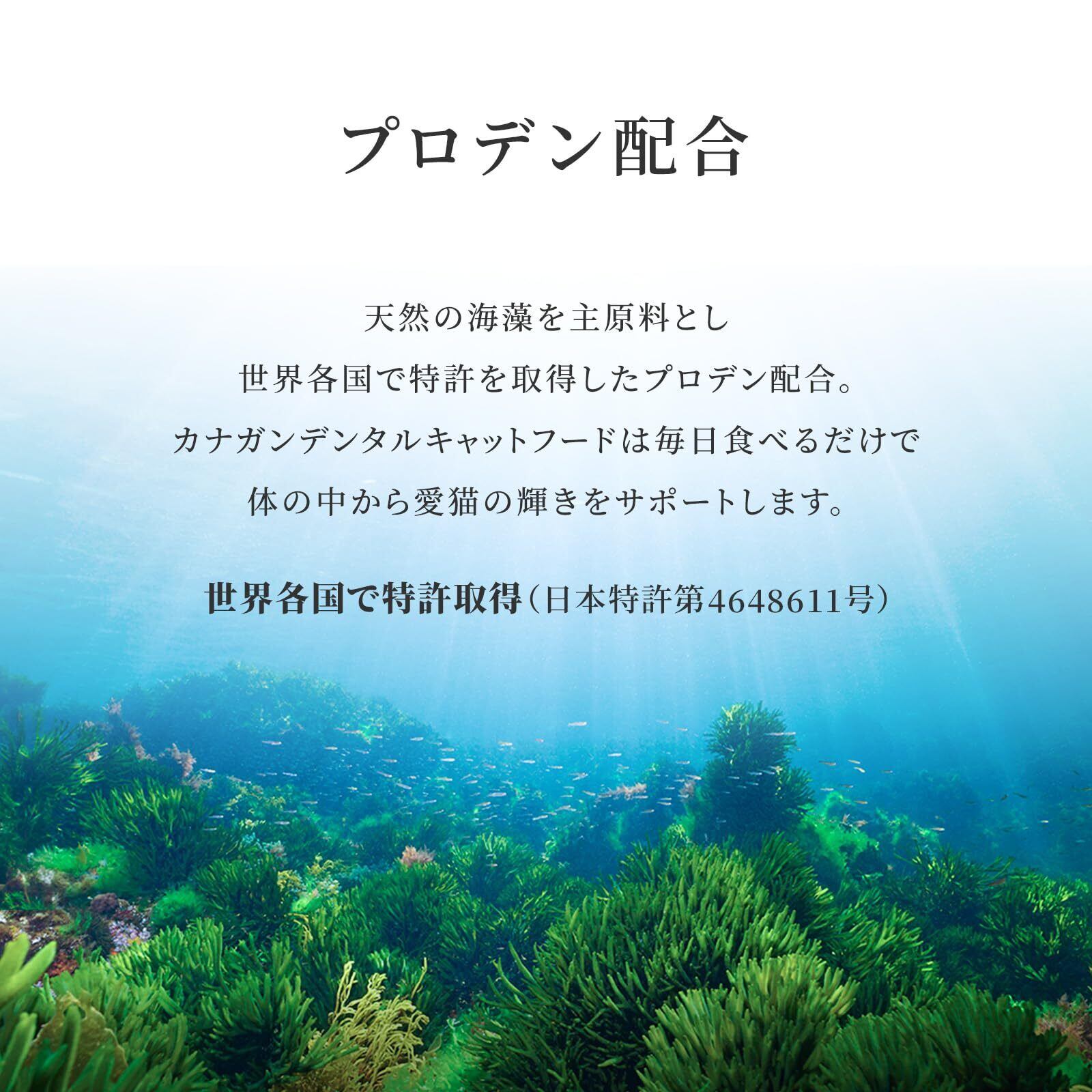 【特許取得のケア成分「プロデン」配合】「カナガンデンタル」に使用している、海藻由来の特許取得※成分。愛猫の“輝き”をサポートします。※日本特許 第4648611号