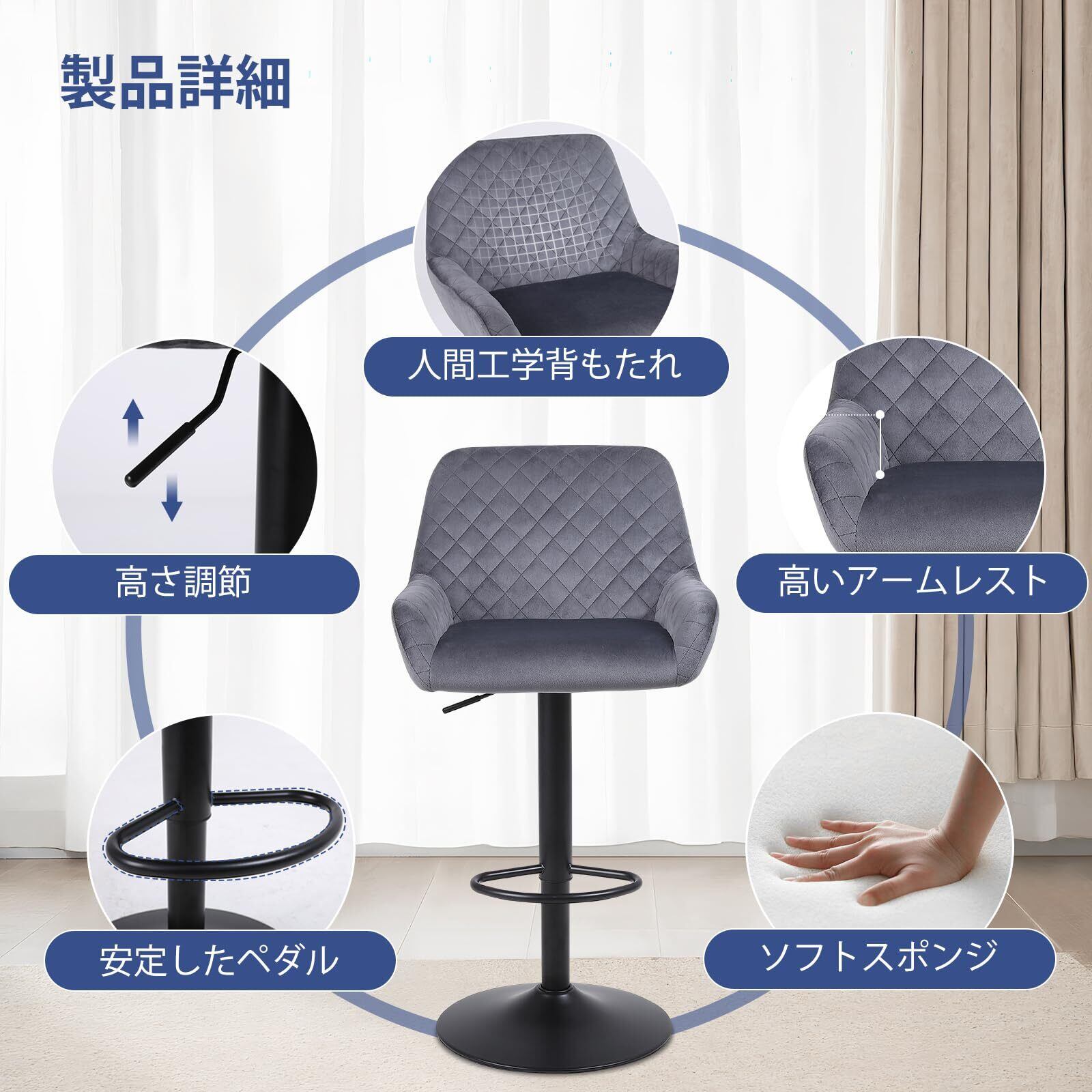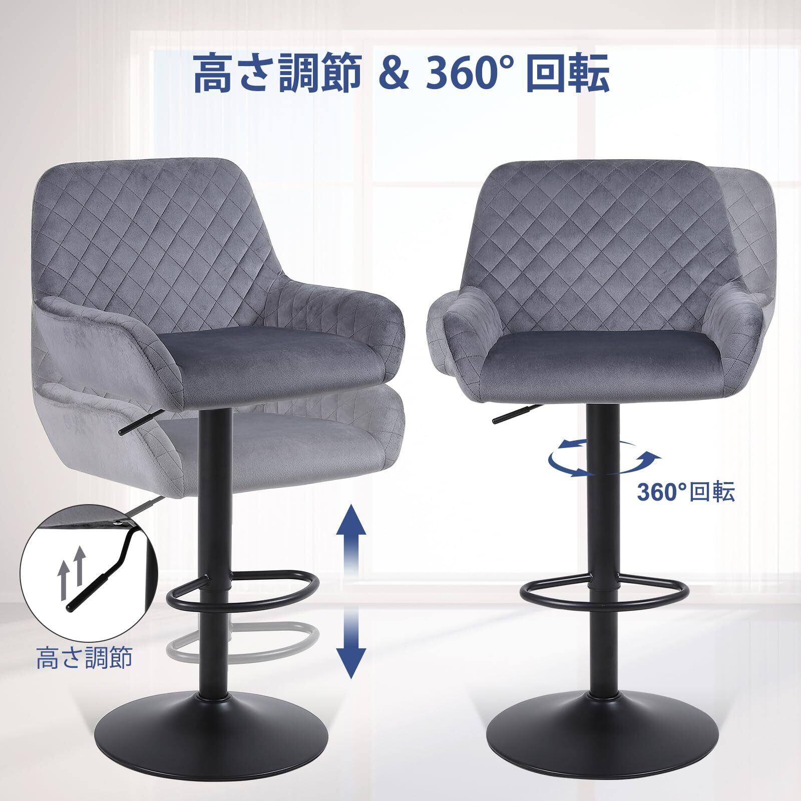 【在庫セール】Youhauchair カウンターチェア ベルベット生地 高さ調節可能 回転式バーチェア 背もたれ 肘掛け付き 足置き バースツール バー、カウンター、キッチン用 2脚セット-グレー | ニコニコSHOP