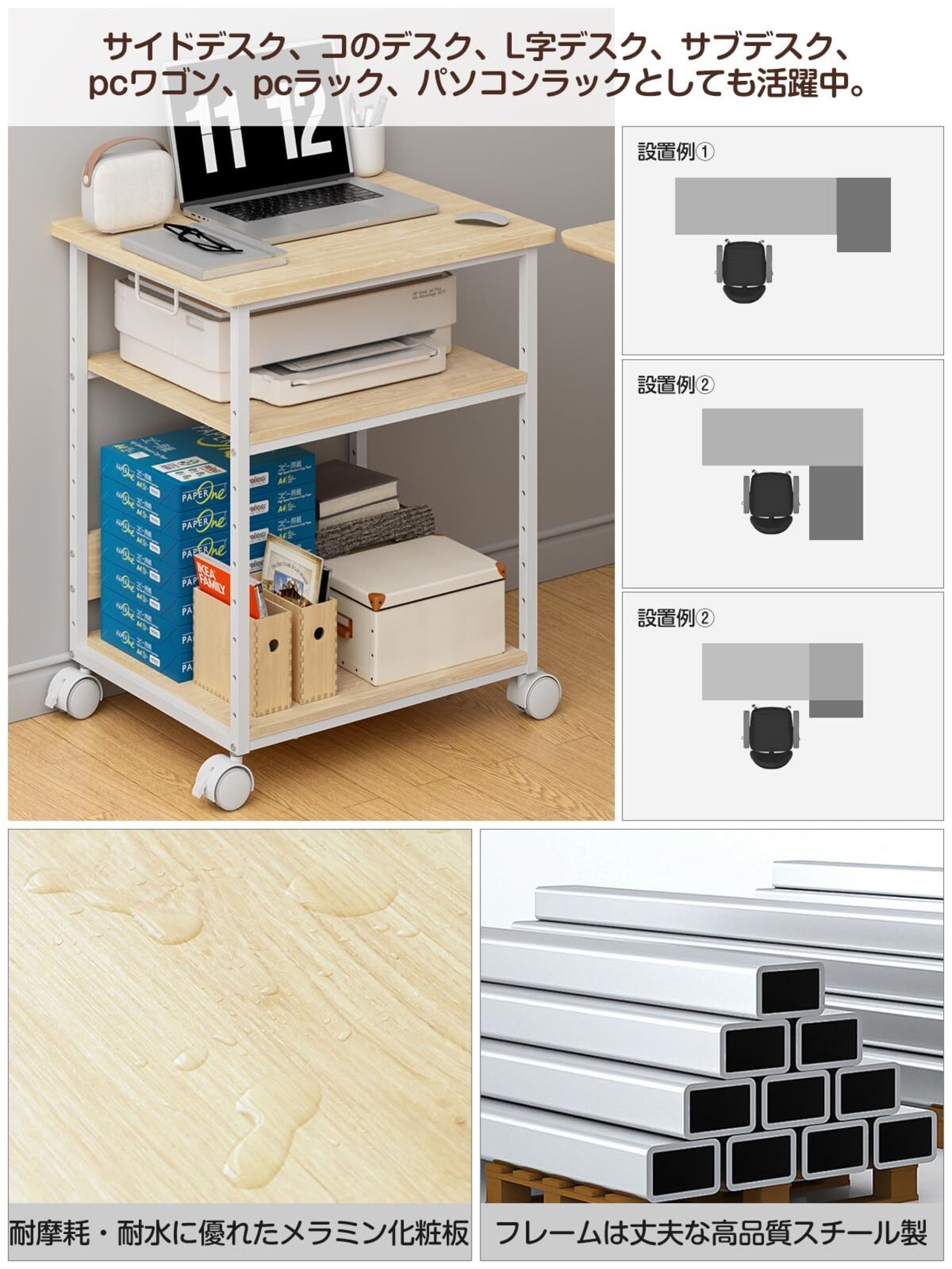 【デスクと並べて使える70cmの最適な高さ設計】一般的なデスクと同じ高さ70cmでデスク横に最適な3段のプリンター台です。デスク横に設置して、サイドデスクや補助作業台としても活用可能。プリンターを手の届く範囲に置くことで、作業効率が飛躍的にアップ。さらに、プリンタラックとしてだけでなく、パソコンデスクや作業用サイドワゴンとしても幅広くご使用いただけます。