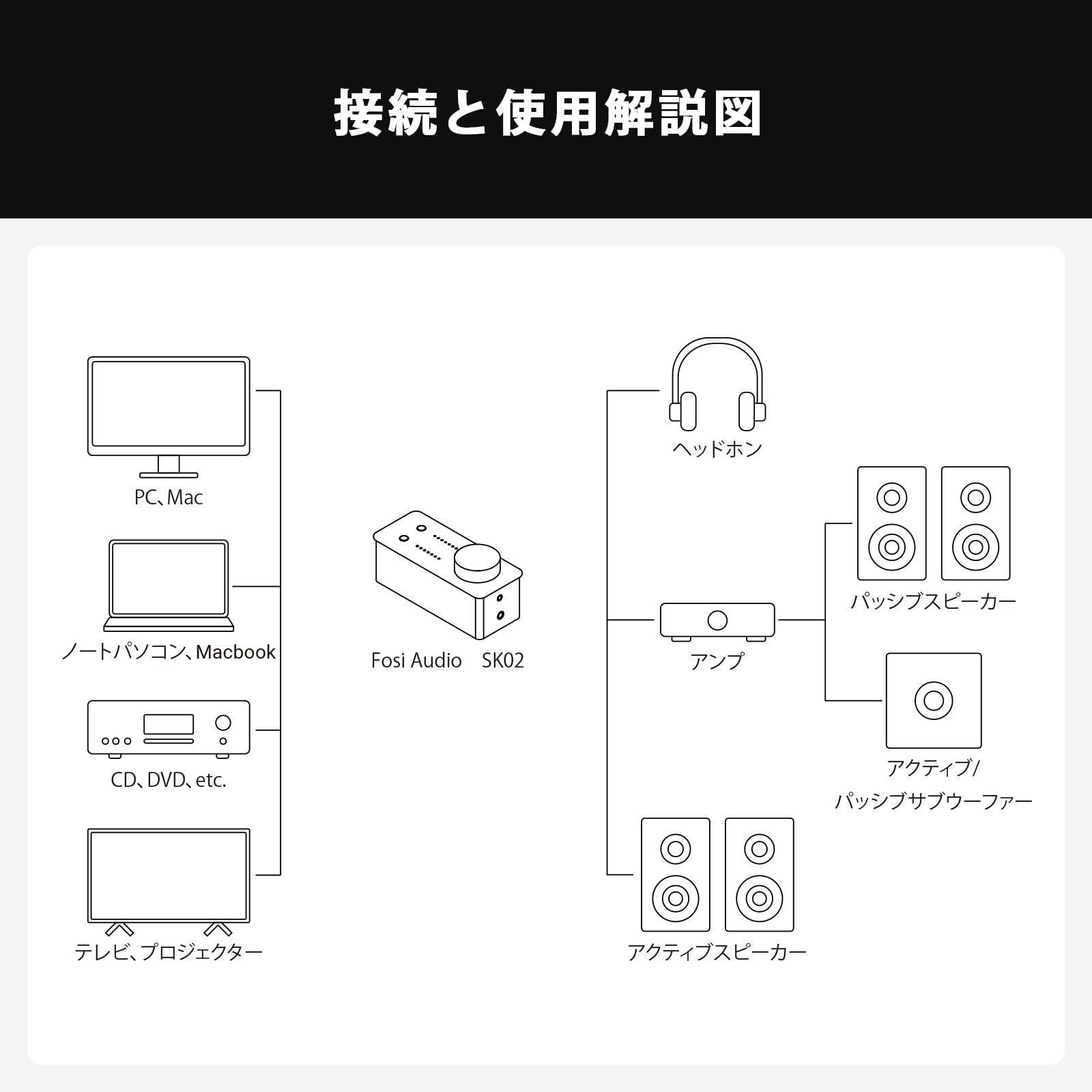 【在庫セール】Fosi Audio SK02 DAC アンプ 小型 ヘッドホンアンプ デスクトップ USB C to AUX デジタル アナログオーディオンバータアダプター コンパクト プリアンプ ホームオーディオ 家庭用 光入力 3.5mm 4.4mm バランスコンボ 黒 ケーブル/日本語説明書付き | ニコニコSHOP