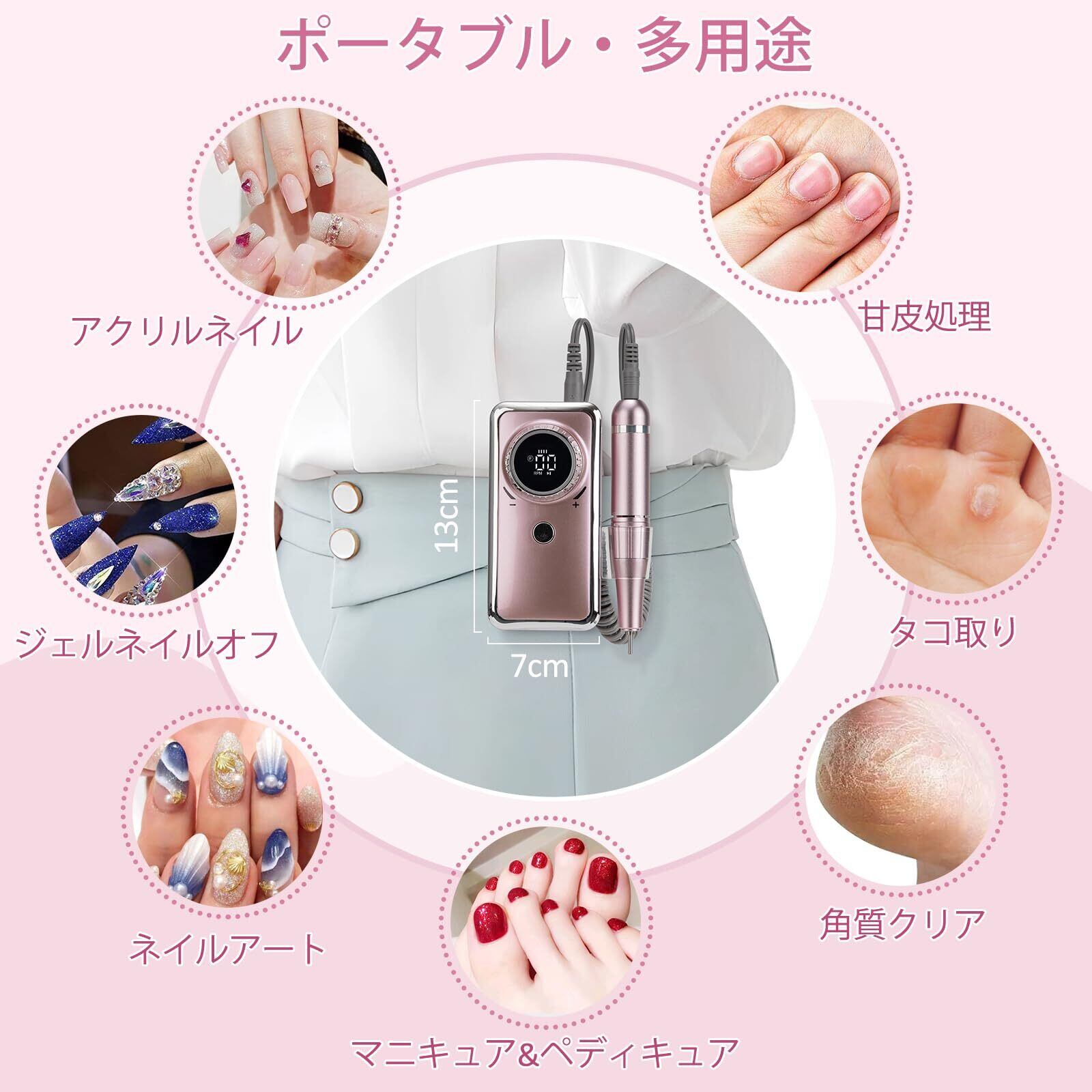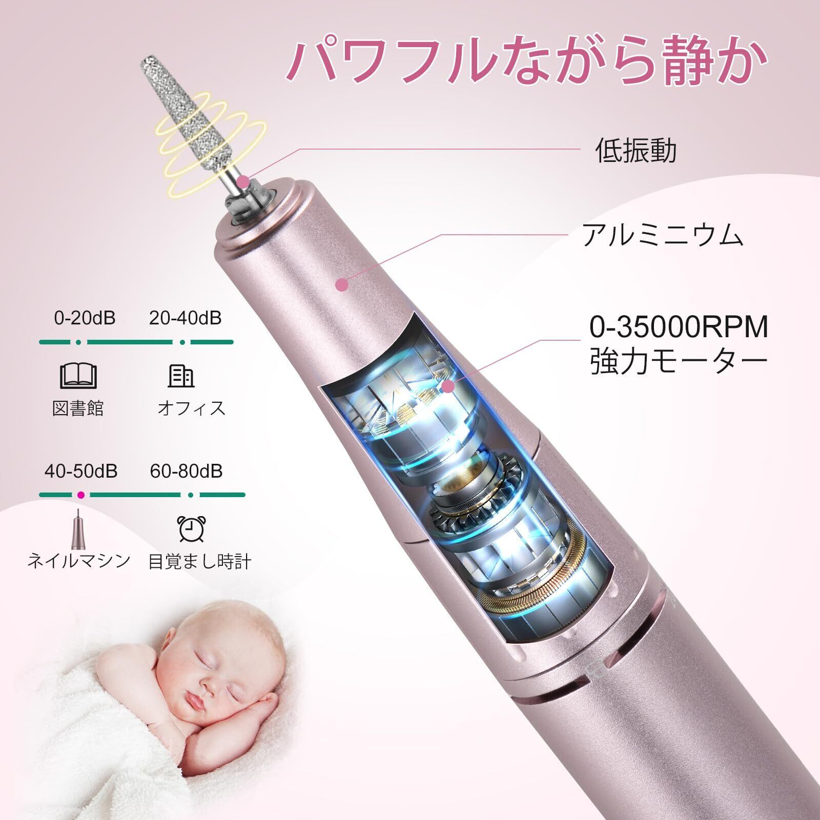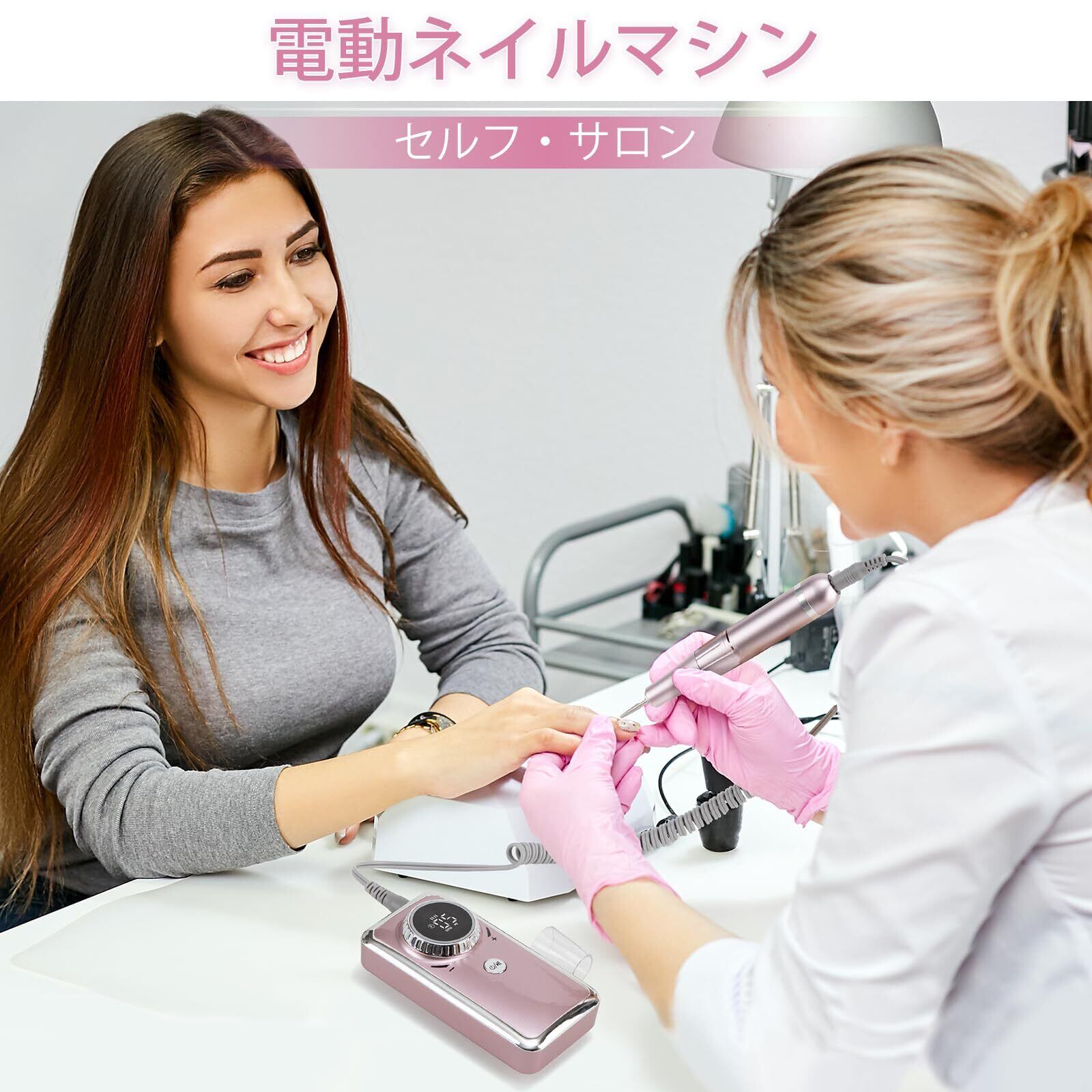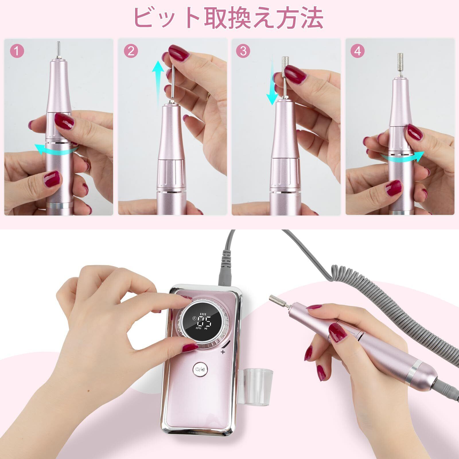 【在庫処分】Madenia 充電式ネイルマシン 電動ネイルマシン プロ用 ビット付け ネイルマシーン アクリルネイル 35000RPM 高速回転 正逆回転 無階段変速 一時止め プロネイルマシン ネイルケア 初心者可 ネイルサロン 自宅用 ネイルビット&サンディングバンド付け ピンク | ニコニコSHOP