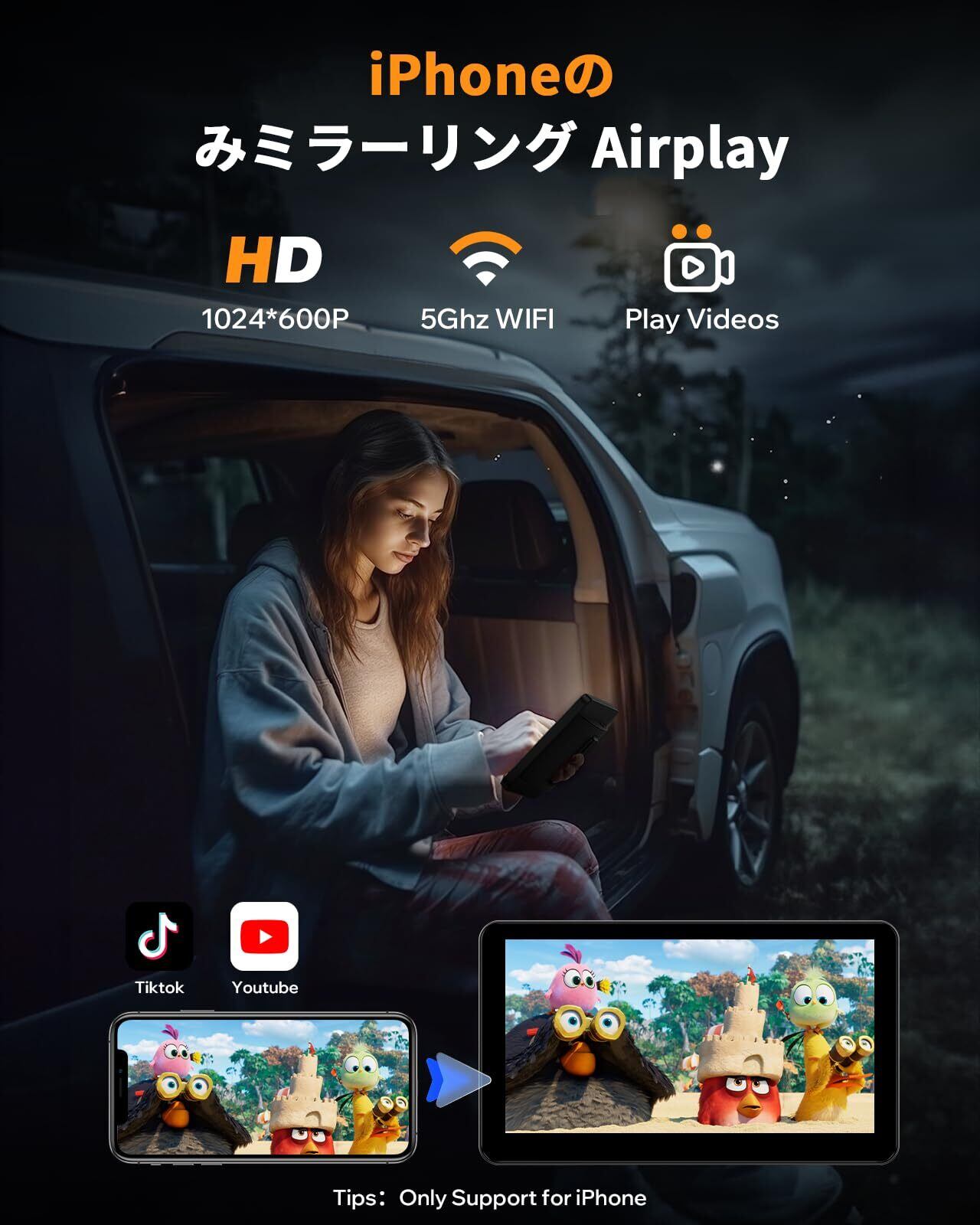 【ミラーリング機能】スマホとカーオーディオ一体型を同じWi-Fiに接続する必要があります。接続後、YoutubeやTikTokなどのビデオを再生することができ、スマホに撮影された写真や動画を見ることもできます。