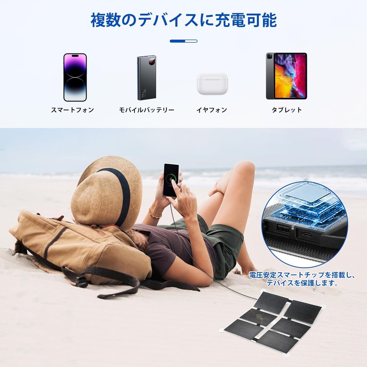 【2ポート搭載】ソーラー充電器にはUSBポートとType-C出力ポートを搭載しており、スマートチップによって接続されたデバイスを自動で識別し、最適な電流を供給します。USBポートは5V/2A、Type-Cポートは5V/2.4Aの出力に対応し、2ポート合計で最大2.4Aの出力が可能です。※出力ポートは防水仕様ではありませんので、水や液体が入らないよう十分ご注意ください。