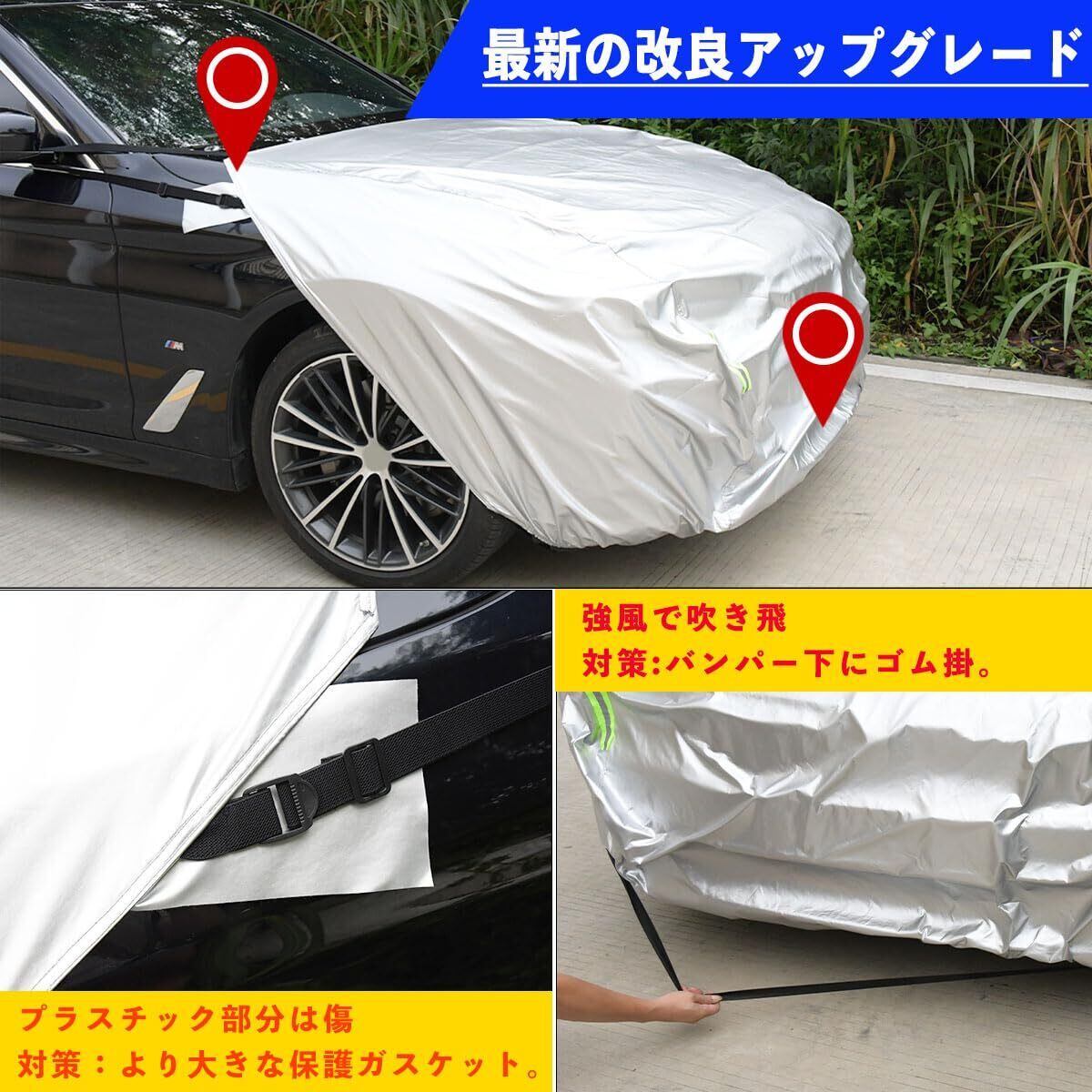 【ゴムバンドで長さ調整】バックミラーに固定されているロープは弾性ゴムバンドを採用しています、ボンネットの面積に合わせて、適した長さに調整することができる。ドアミラーへのロープ固定タイプ 強風対策:1,裾部強力ゴム使用。2,フロントバンパー下にゴムベルトを装着し、強風でカバーがひっくり返る心配もありません。