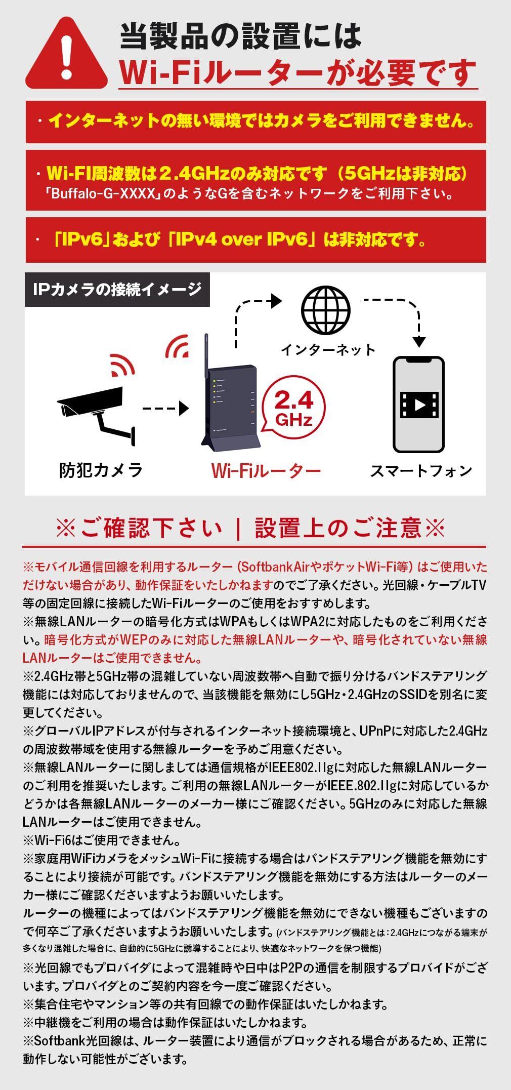 1080p Wi-Fi ホームネットワークカメラ 2.4GHz帯Wi-Fiに対応(5GHz帯非対応 WEP方式非対応)※SoftBank Air等の無線式の回線(モバイルWi-Fiルーター)では使用できません。無線式の回線ではセキュリティの観点からUPnPによるポート解放、DDNS(ダイナミックDNS)やP2Pによる通信をブロックしているためです。本カメラは外出先からアクセスする際に上記通信方法を使用しているため、詳細はサービス提供業者にお問い合わせください。