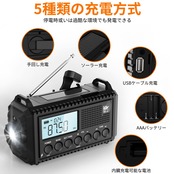【5000mAh超大容量電池&5つの給電方式、災害などの緊急時に役立ちます】電力を気にしないでください!該当防災ラジオには5つの充電方法があります。ハンドクランク、ソーラーパネル、マイクロUSBケーブル、単4電池(別売)、ACアダプターがバックアップ電源として機能し、防災ラジオをいつでも携帯できるようにします。そしてどこでも!ハンドクランクとソーラーパネルはどちらも、ラジオ、ライト、SOSアラームを必要なときにすぐに使える状態に保つのに十分な電力を再生することができます。充電式電池と単4乾電池3本(別売)で、電力を回生できないときでも確実に電力を供給できます。マイクロUSBケーブルでハンドクランクラジオ(充電式電池は含まれています)を充電できます。 (注:ACアダプターは含まれていません)