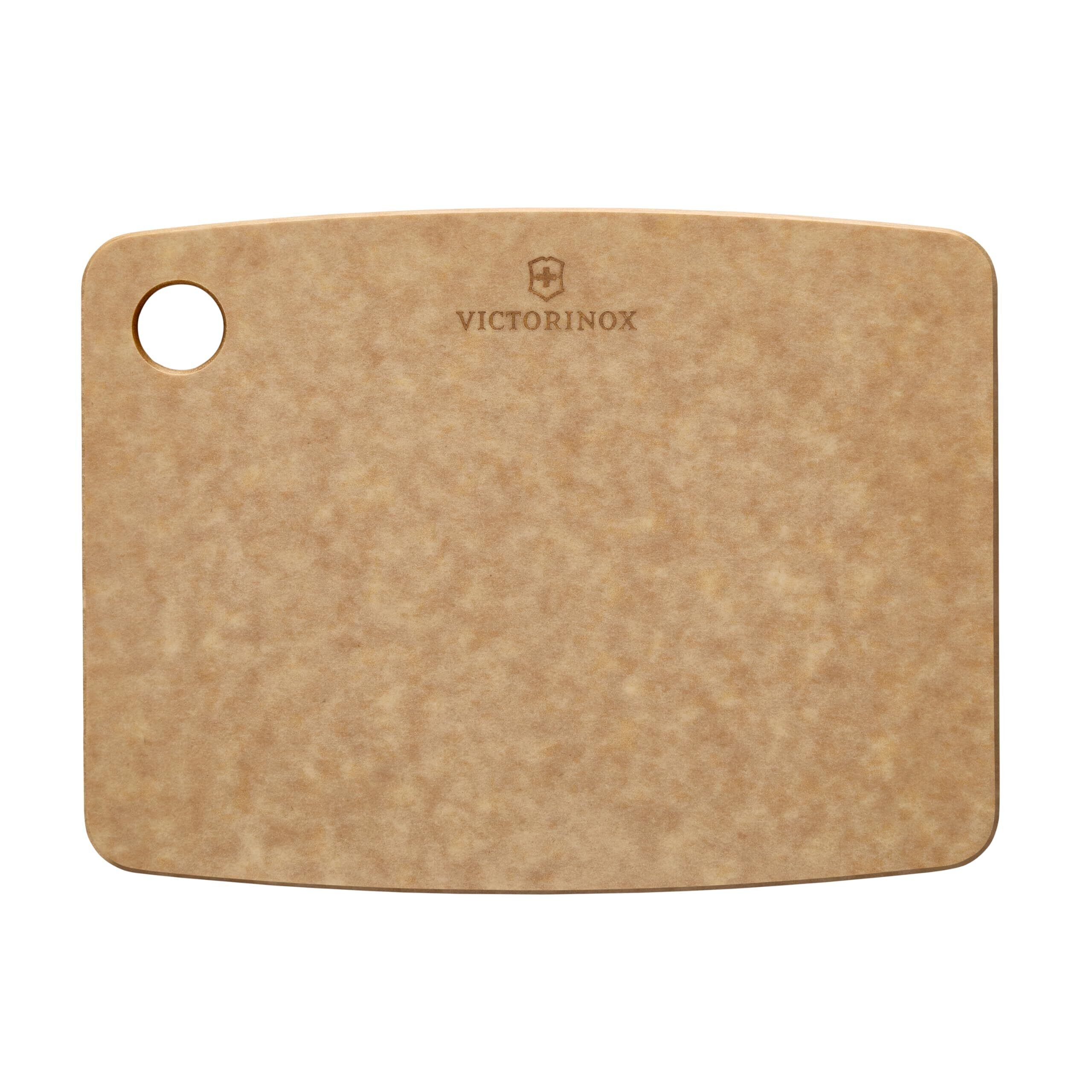 カッティングボードの素材、セルロース繊維加工品は、木工品のような暖かみと素晴らしい外観ながら、 軽くて薄く、食器洗い乾燥機に対応します。さらにプラスチックや通常の木製ボードと比較して非常に丈夫で、深い切り傷を最小限に抑えることができ、また木製ボードのように乾燥でひび割れることもありません。ビクトリノックスのカッティングボードは、非常に衛生的で、清潔に保ちやすく、プラスティックボードのようにマイクロプラスチックが食べ物に混入するリスクも回避できます。この素材は食品に使っても安全な樹脂を上質なクラフト紙に浸し、紙の向きを交互に変えながら重ね均等な熱と圧力でプレスすることで、紙の層を結合させ、しっかりとした安定したシート状の素材に仕上げています。