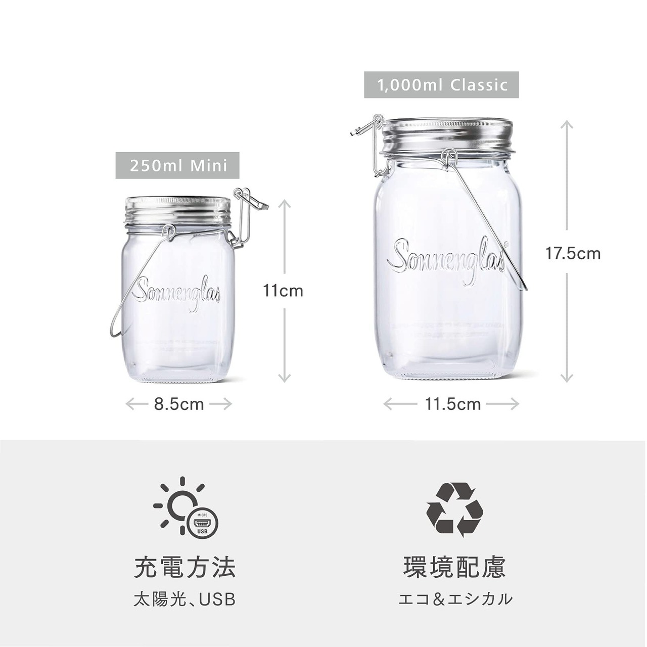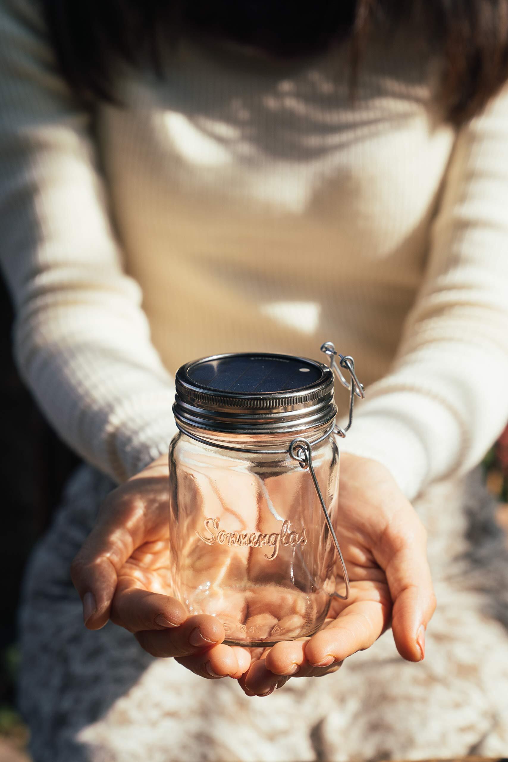 ソネングラス︎は誰もが利用できる再生エネルギーである太陽光を、より手軽に、より美しく日常生活へ取り込むことを可能にするメイソンジャー型のソーラーランタンです。ドイツ発の最先端グリーン技術を搭載したソーラートップ ソモ︎(蓋部分)で日中に太陽光で充電、夜には電球色の明かりを灯します。瓶はデコレーションが可能でDIY感覚で自身の世界観を表現できます。