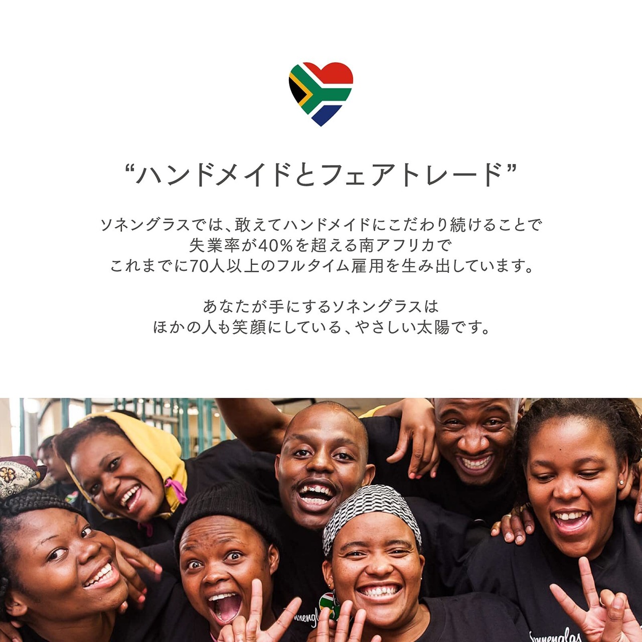 【南アフリカでフェアトレード製造】ソネングラスの製品は、若年層の失業率が60%を超える、南アフリカ共和国でフェアトレード体制で生産されています。ハンドメイドの生産体制にこだわり続けることにより、2013年の創業から現在に至るまで、現地で失業中の人々への雇用を生み出し続けています。工場のスタッフは年金・健康保険など社会保険を完備し、現地の中間所得層以上の待遇で働いています。南アフリカから入荷されたすべてのソネングラス︎は国内で検品後、お客さまのもとへ発送されます。