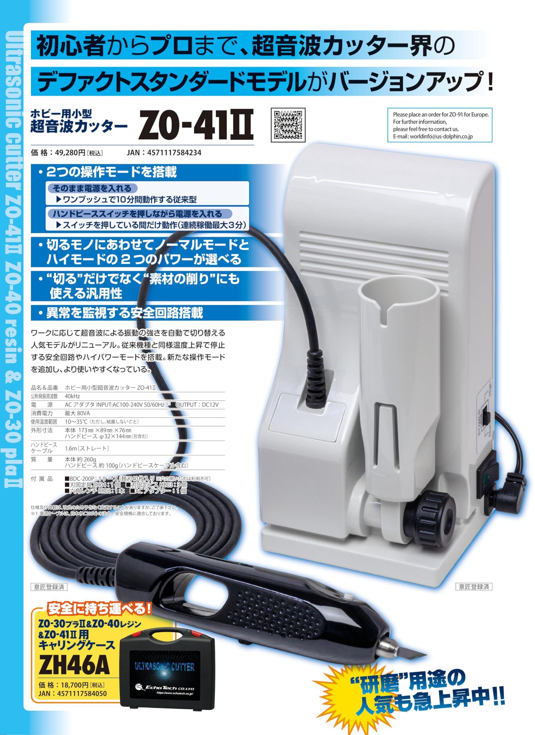 ・ホビー用超音波小型カッターZO-41II<br> ・ワークに応じて超音波による振動の強さを自動で切り替える人気モデル。<br> ・2つのパワーを選べ、切るモノによって変えることができます。(ハイモードは、ここぞ!という時に)<br> ・2つの操作モードを搭載しており、選択できます。・超音波メーカー本多電子で製造しています。