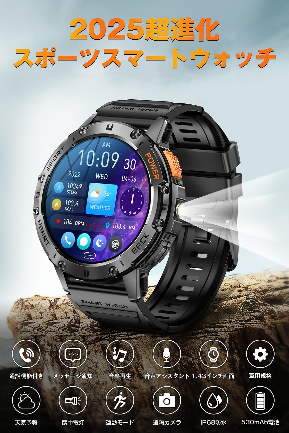 スマートウォッチ 【2025革新モデル 軍用規格&防水防塵耐衝撃】1.43インチAMOLED高精度画面 懐中電灯付き 通話機能付き 530mAh長持ちバッテリー iphone対応 アンドロイド対応 メッセージ通知 音楽再生 音声アシスタント 腕時計 100+種類運動モード Smart watch スポーツウォッチ 文字盤自由設定 天気予報 メンズ レディース