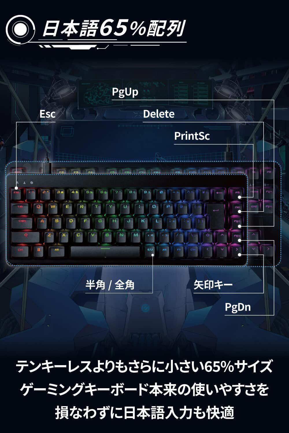 ガンシューティング系ゲーム(FPS)の高速な指の動きにもぴったりハマるサイズ感、キー配列、キー形状を精緻に作り上げた、銀軸搭載の65%サイズゲーミングキーボード、LED搭載モデルです。