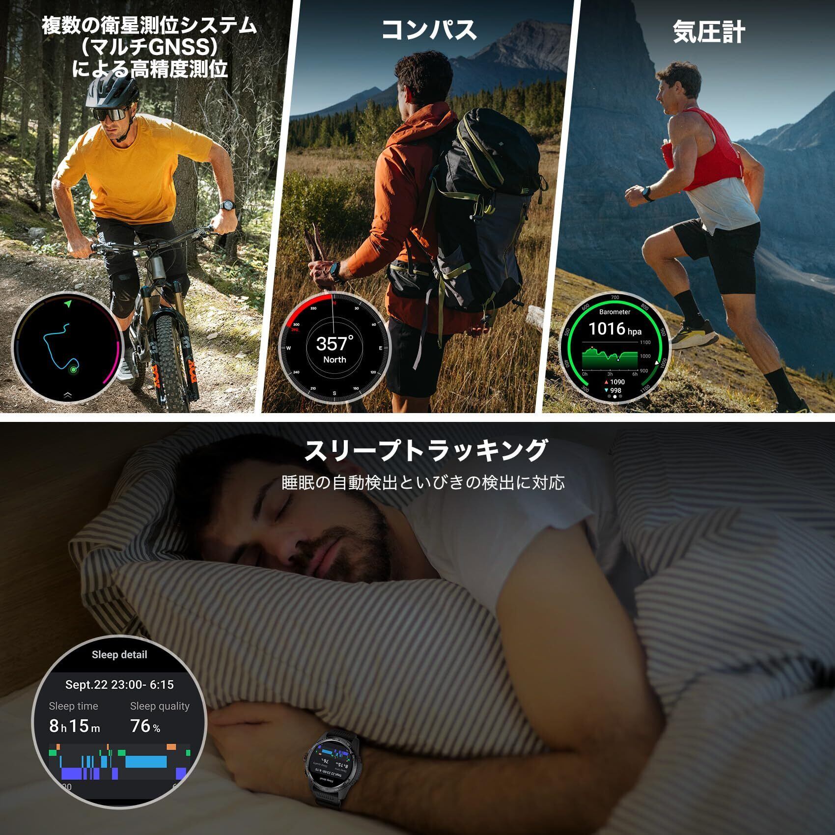 【超低消費電力ディスプレイ】:超低消費電力ディスプレイは、スマートモードとエッセンシャルモードをシームレスに切り替えることが可能です。さらに傷のつきにくいサファイアクリスタルガラス製ディスプレイは、屋内でのワークアウトから、アウトドア環境での登山やトレイルランニングまで、過酷な環境下でも鮮明な視認性を保証します。コンパス、気圧計、高度計を搭載